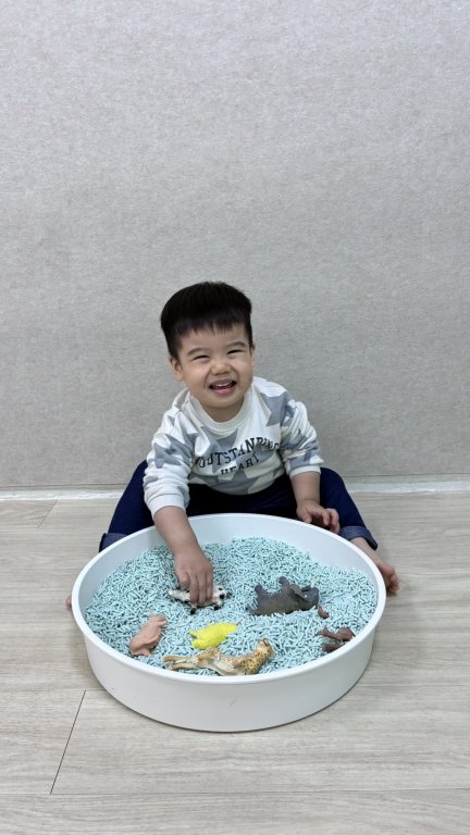 寶貝在恐龍樂園中開心探索小手觸摸草地(菜瓜布),感受粗粗的觸感,刺激觸覺發展;拍拍、摸摸河流(塑膠袋),聽聽沙沙聲,感受滑滑的質感。同時拿起恐龍玩偶觀察與玩耍,練習手部抓握與感官探索,在遊戲中快樂學習。看著寶貝拿著恐龍開心探索樂園,每一個充滿好奇的小動作,都是成長與學習的開始喔!
