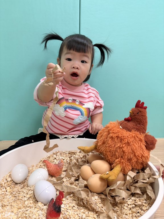 活動中利用感官盆活動,透過各種素材,讓寶貝們用手觸摸、抓取去探索,從遊戲中自然認識農場動物,享受探索的樂趣,也刺激幼兒觸覺、視覺與嗅覺感官呢~