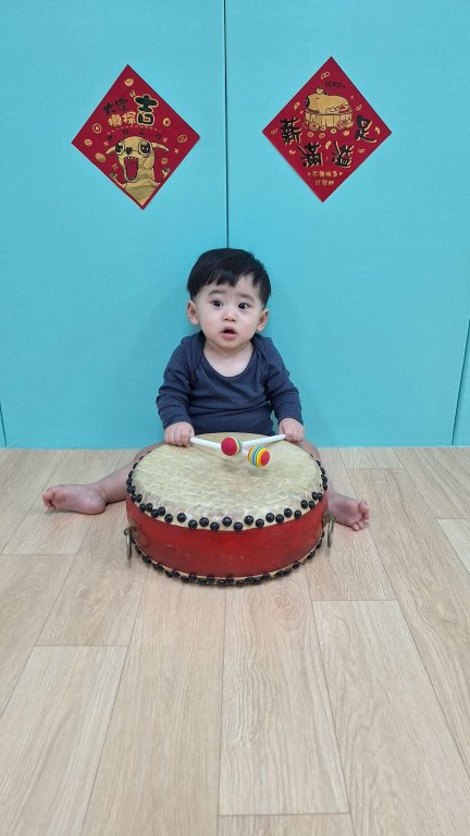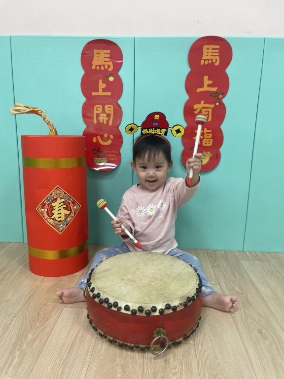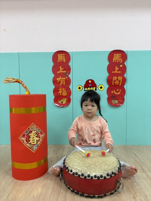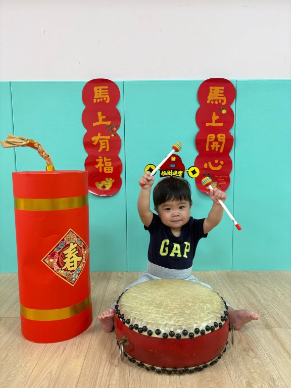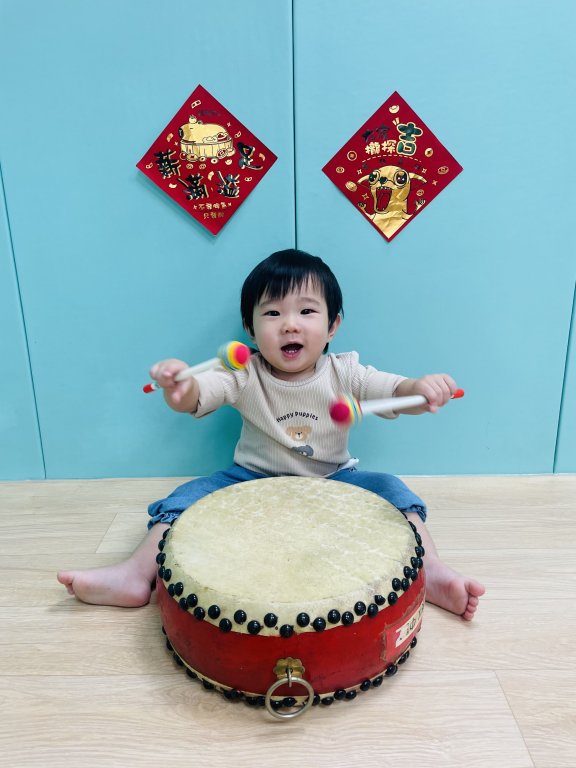 過年氣氛中準備了中國鼓與鼓棒,孩子一起感受熱鬧的新年節奏,孩子雙手拿著鼓棒,在老師的引導下輕輕敲打鼓面,聆聽「咚咚咚」的聲音,臉上露出好奇又開心的表情,透過敲鼓的過程,孩子不僅能練習手部抓握與雙手協調,也能在聲音的刺激中提升聽覺專注力,感受過年熱鬧、歡喜的氛圍,在一次次的敲打中,孩子用自己的方式迎接新年的到來,留下滿滿的節慶回憶。