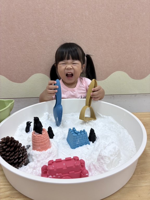 看看寶貝們一起玩雪感官盆~小手拿著剷雪工具,挖挖雪