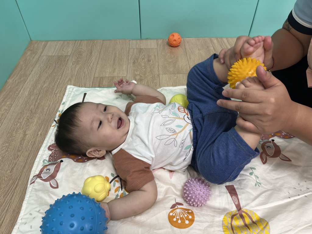 觸覺球滾背活動,透過球的輕柔按摩刺激背部,幫助寶寶放鬆身體,提升觸覺感受,寶寶過程中表情愉快。
