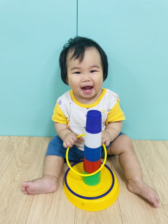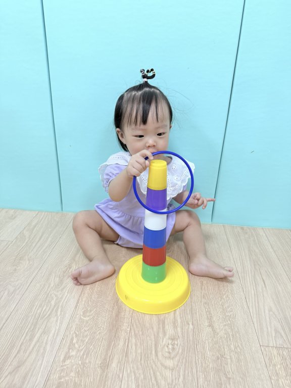 帶領寶貝們開始認識第一個基本圖形「圓形」 ,透過套圈圈遊戲開始認識,雖然幼兒年紀還小,但透過眼睛的追視、雙手的抓握,以及模仿老師將圈圈套入柱子的動作,不僅讓幼兒玩得開心,也在無形中強化了對圓形的初步認知與記憶。