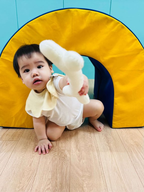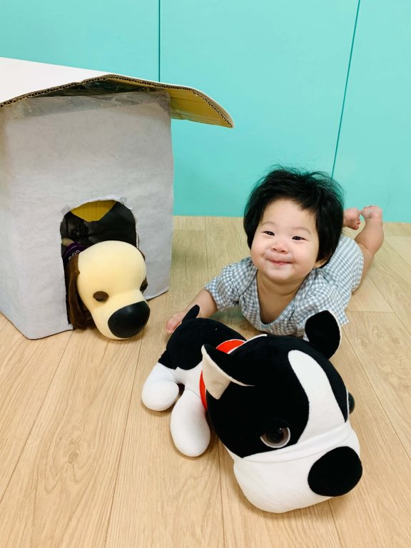 引導寶貝利用身體四肢的力量匍匐移動探索、透過視覺及觸覺鉗握狗骨頭,訓練寶貝大小肌肉的發展,使手腳、眼、腦全方位刺激及有利於動作協調和四肢關節的穩定喔 !