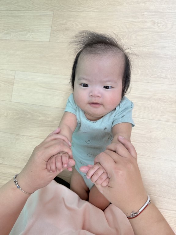 「寶寶在老師的協助下,開心地敲打螃蟹鈴鼓,感受節奏的變化與聲音的樂趣,培養手眼協調能力與聽覺反應!」