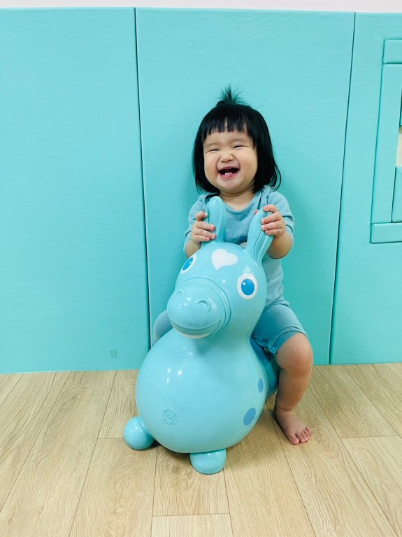 寶貝趴趴大龍球可以刺激寶貝的前庭覺與大肌肉的發展/坐上跳跳馬可以訓練孩子的平衡感看看寶貝們活動中燦爛的笑容