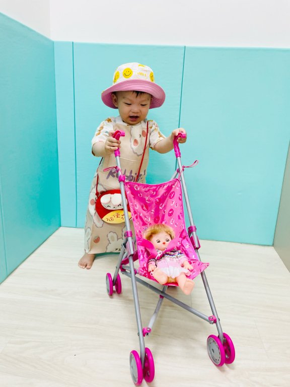 透過活動角色扮演遊戲有助於培養孩子的同理心與同儕互動的人際技巧,寶貝照顧娃娃的模樣架式十足呢!