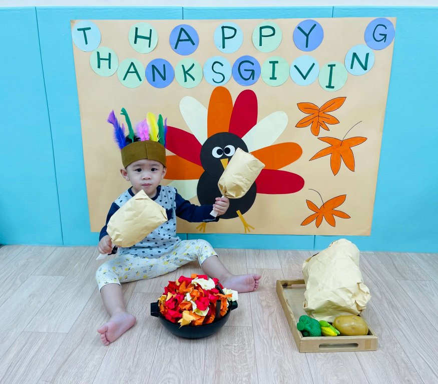 寶貝們參加了一場歡樂的感恩節派對唷!派對中,寶貝們帶著「印地安羽毛頭飾」,在溫暖的火堆旁,烤著香噴噴的火雞,玩得非常開心呢!
