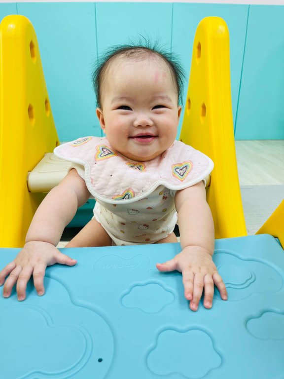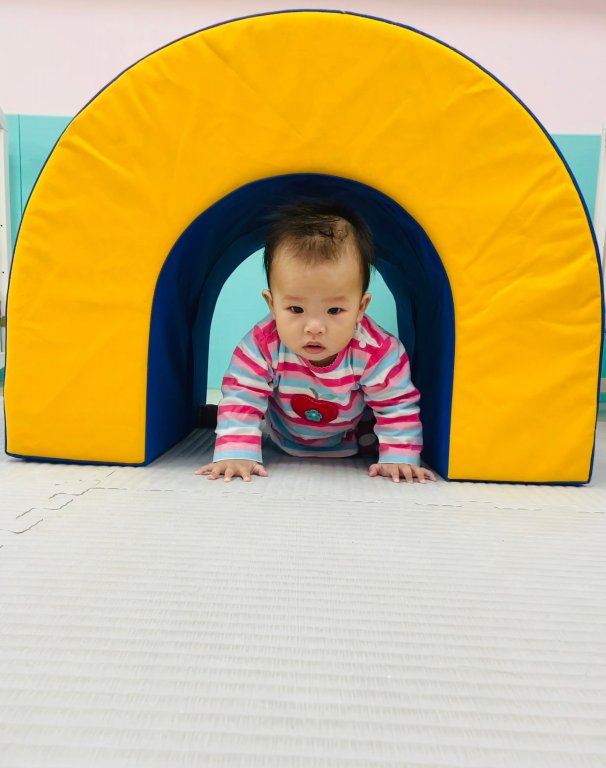這次活動利用活力體能組的U型拱橋器材,讓寶貝展開四肢對稱交替前進的爬行動作,透過鑽爬活動,可以促進四肢和軀幹主要大肌肉群的均衡發育~健力架上圓形形狀吊飾,顏色鮮豔能吸引寶貝視覺追視,利用眼睛來探索,並伸出小手抓呀抓,培養手眼協調,同時訓練大肌肉動作發展。