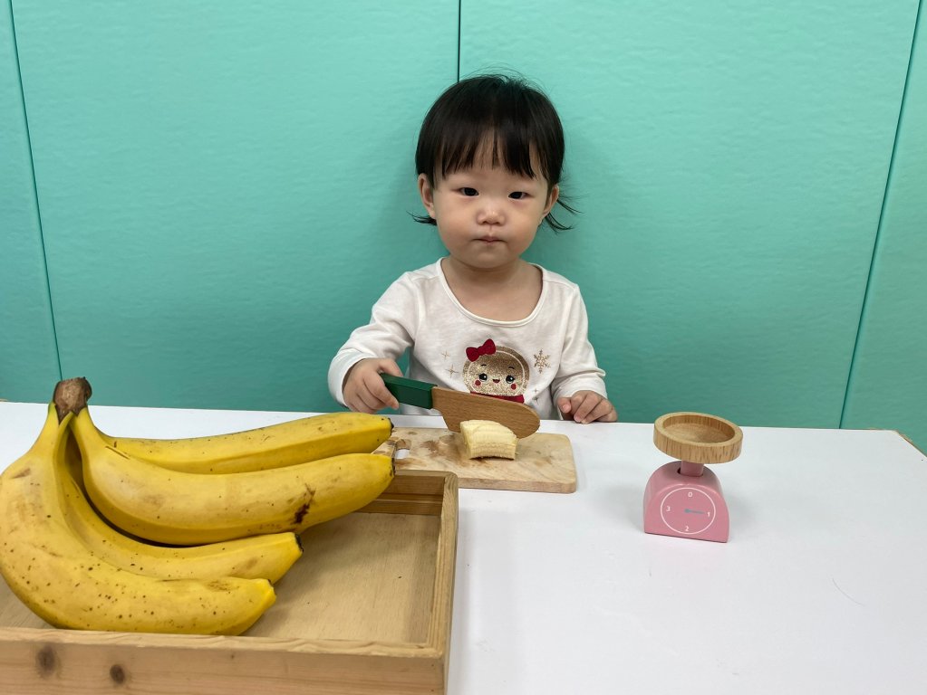 這次的水果主題課程,透過圖卡、繪本讓寶貝們認識香蕉,也帶領寶貝們實際接觸實物,認識香蕉的外型,在進行「切」的精細動作中,讓寶貝對香蕉整體更加認識,從中也培養生活自理能力。