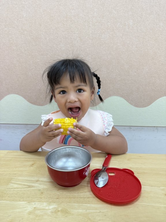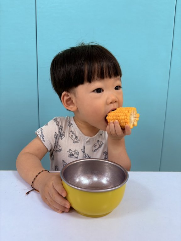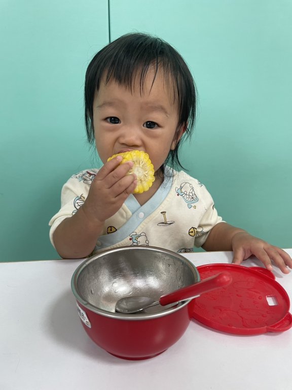 寶貝品嚐美味香甜的玉米,並將自己的餐碗收拾唷!