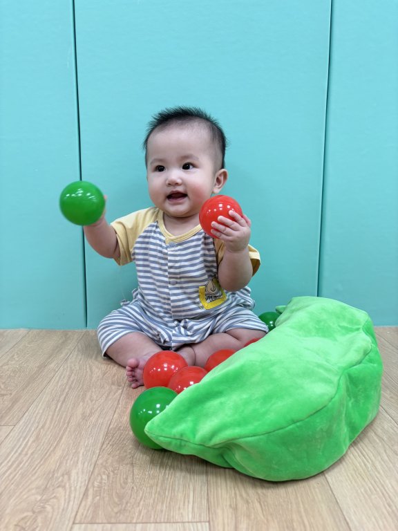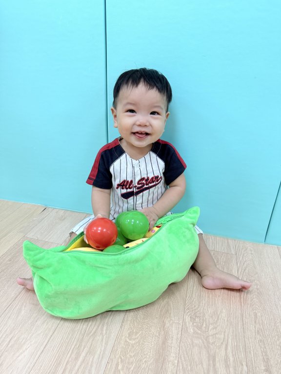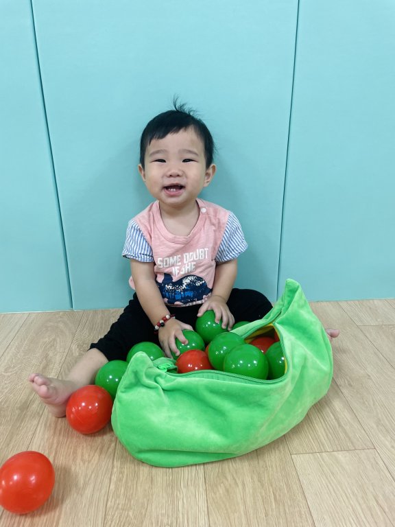 幼兒參與「好多豆豆」的活動,讓幼兒由布豆莢取出海洋球,模擬豆子在豆莢內的模樣,幼兒們對球都非常的喜歡,也能藉由活動觀察幼兒拿取、抓握的動作發展,各色的海洋球也能給予幼兒們視覺上的刺激與色彩辨識的練習唷。