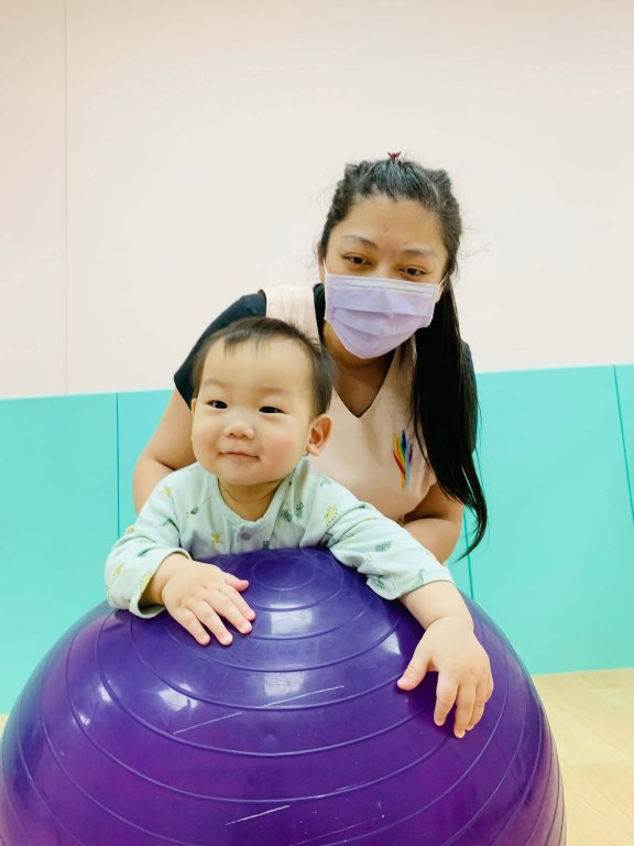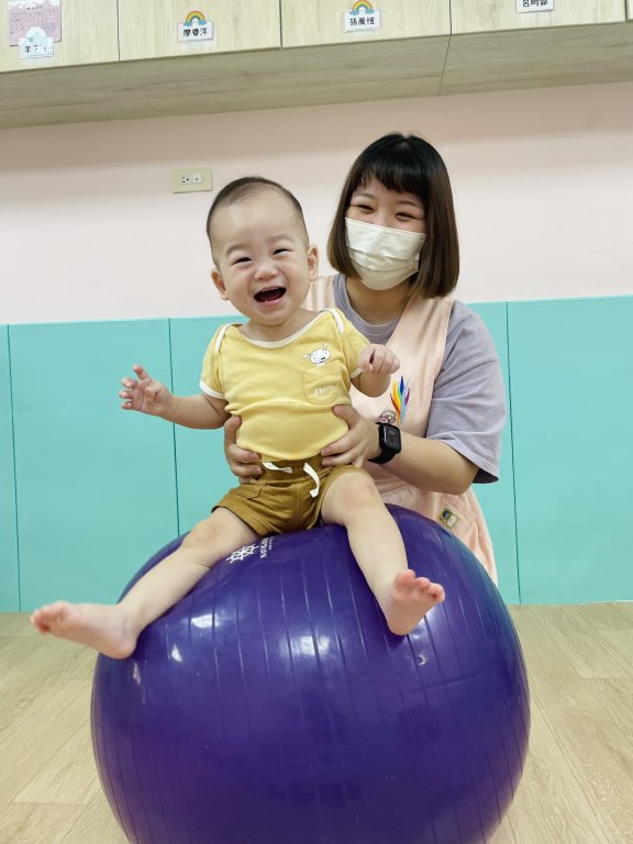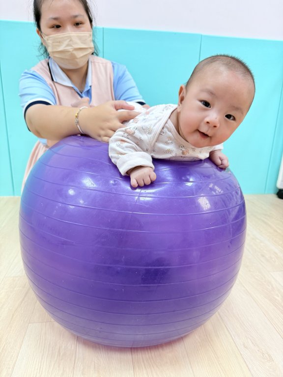 活動中寶貝俯臥、趴在大籠球上,將胸腹部及腿部貼近球面,透過前後左右不同方位的輕輕晃動,有如雪地中的雪球飄滾著!趴一趴練習超強頸背力量、搖一搖在柔軟起伏中尋找平衡。