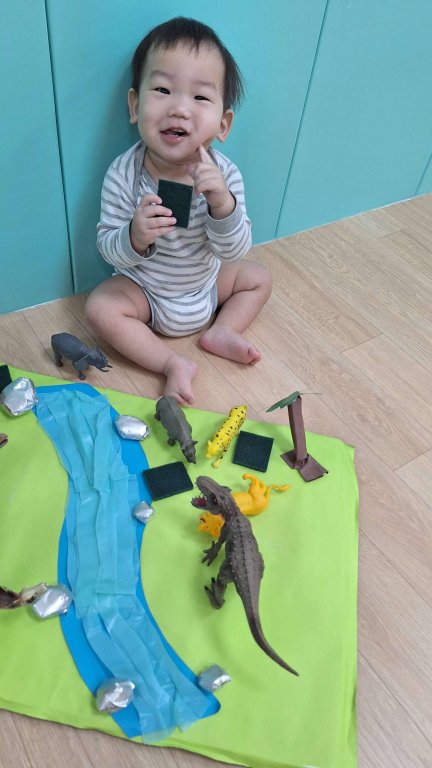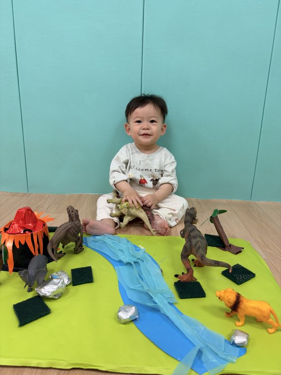 寶貝在恐龍樂園中開心探索小手觸摸草地(菜瓜布),感受粗粗的觸感,刺激觸覺發展;拍拍、摸摸河流(塑膠袋),聽聽沙沙聲,感受滑滑的質感。同時拿起恐龍玩偶觀察與玩耍,練習手部抓握與感官探索,在遊戲中快樂學習。看著寶貝拿著恐龍開心探索樂園,每一個充滿好奇的小動作,都是成長與學習的開始喔!