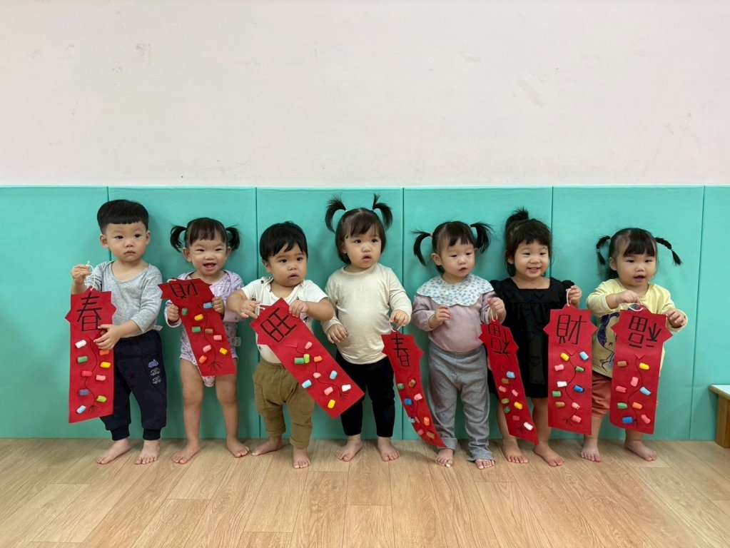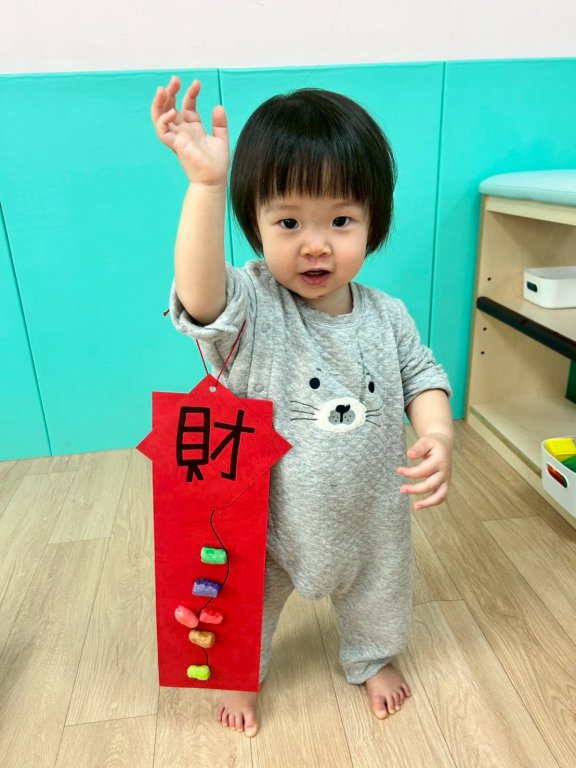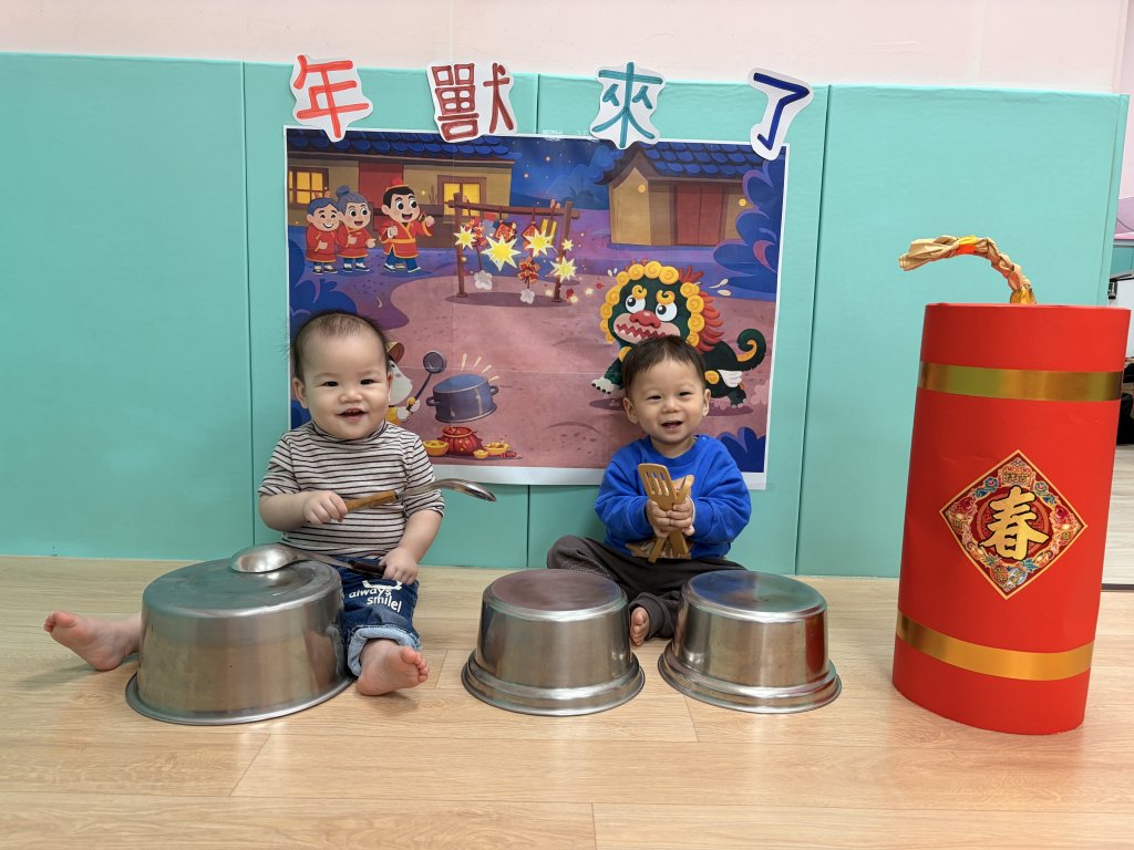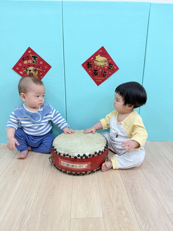 過年氣氛中準備了中國鼓與鼓棒,孩子一起感受熱鬧的新年節奏,孩子雙手拿著鼓棒,在老師的引導下輕輕敲打鼓面,聆聽「咚咚咚」的聲音,臉上露出好奇又開心的表情,透過敲鼓的過程,孩子不僅能練習手部抓握與雙手協調,也能在聲音的刺激中提升聽覺專注力,感受過年熱鬧、歡喜的氛圍,在一次次的敲打中,孩子用自己的方式迎接新年的到來,留下滿滿的節慶回憶。