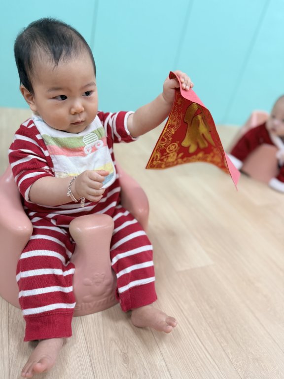 讓寶貝進行簡單的年節操作活動,拍拍紅包袋、摸摸春聯、看看燈籠。透過抓握與觸摸,練習小肌肉發展與專注力,在歡樂氣氛中感受新年的喜悅。