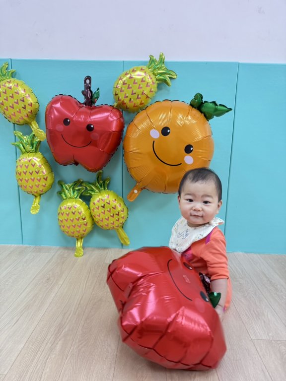 孩子透過觀察與觸摸繽紛的水果氣球,拍一拍、抓一抓,感受不同形狀與觸感,促進視覺注視與手眼協調,在歡樂互動中體驗過年福氣滿滿的氣氛
