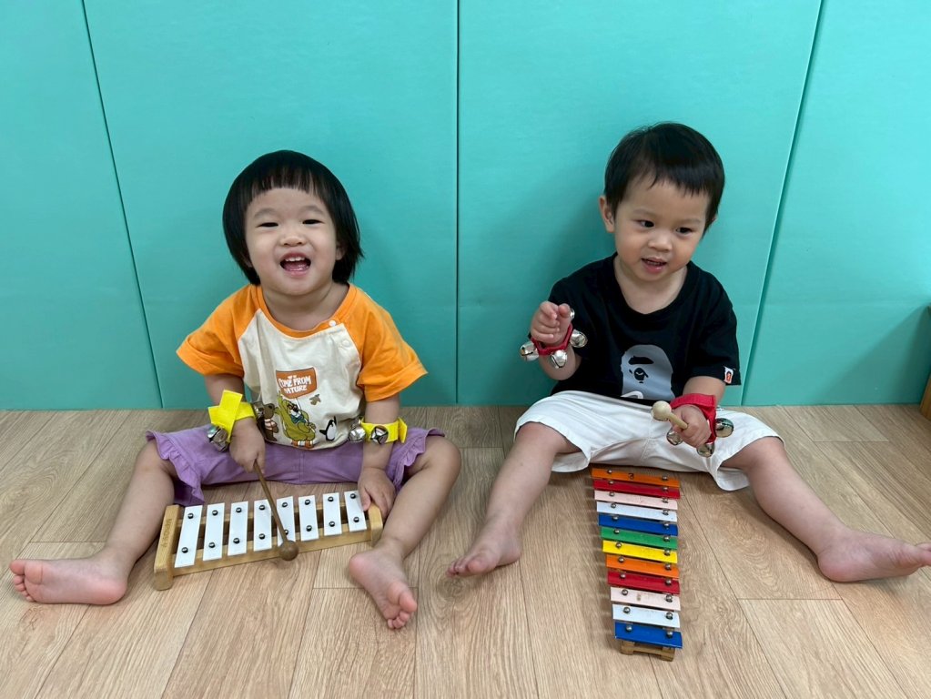 盡情的敲打中,認識不同形狀的樂器如三角形的鐵琴、圓形的鈴鼓與糖果鼓~