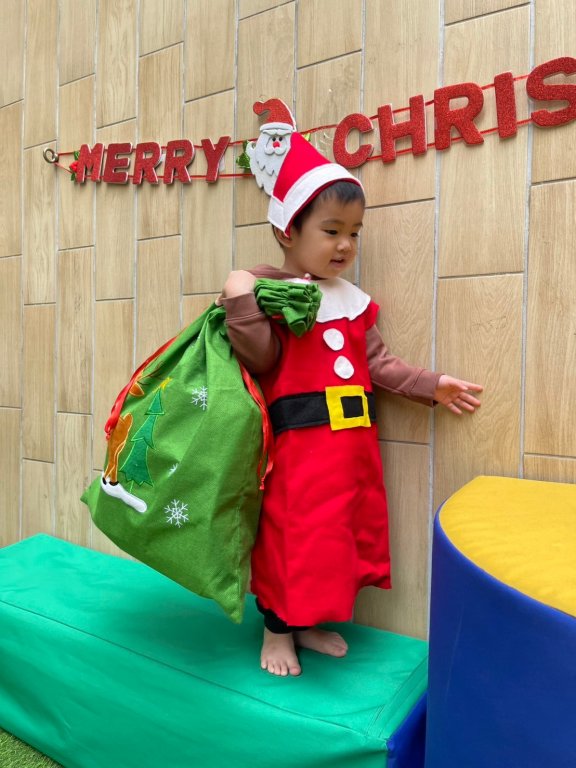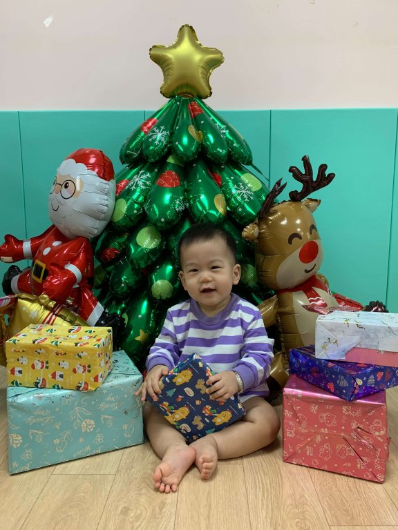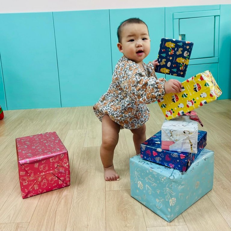 運用色彩繽紛的禮物讓寶貝們拿一拿不同形狀的禮物、將色彩繽紛的禮物疊高高,更能促進寶貝們小肌肉的發展呢!