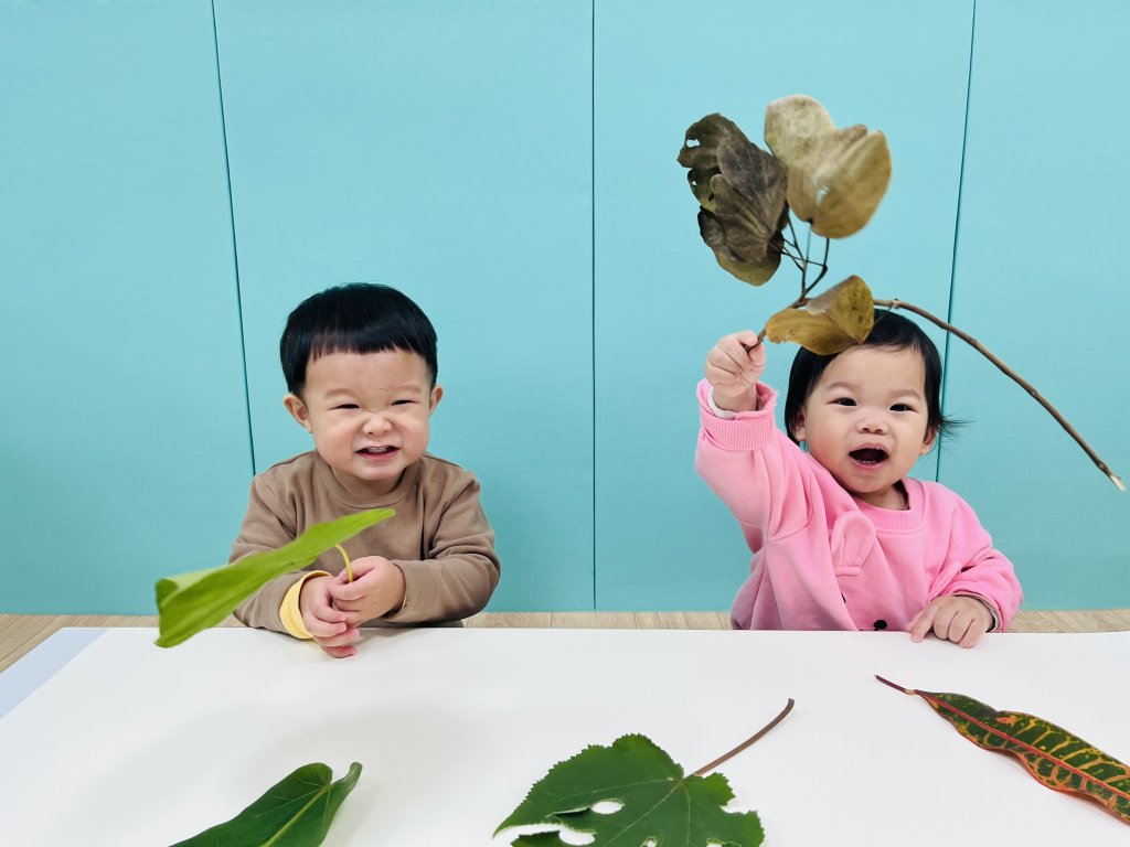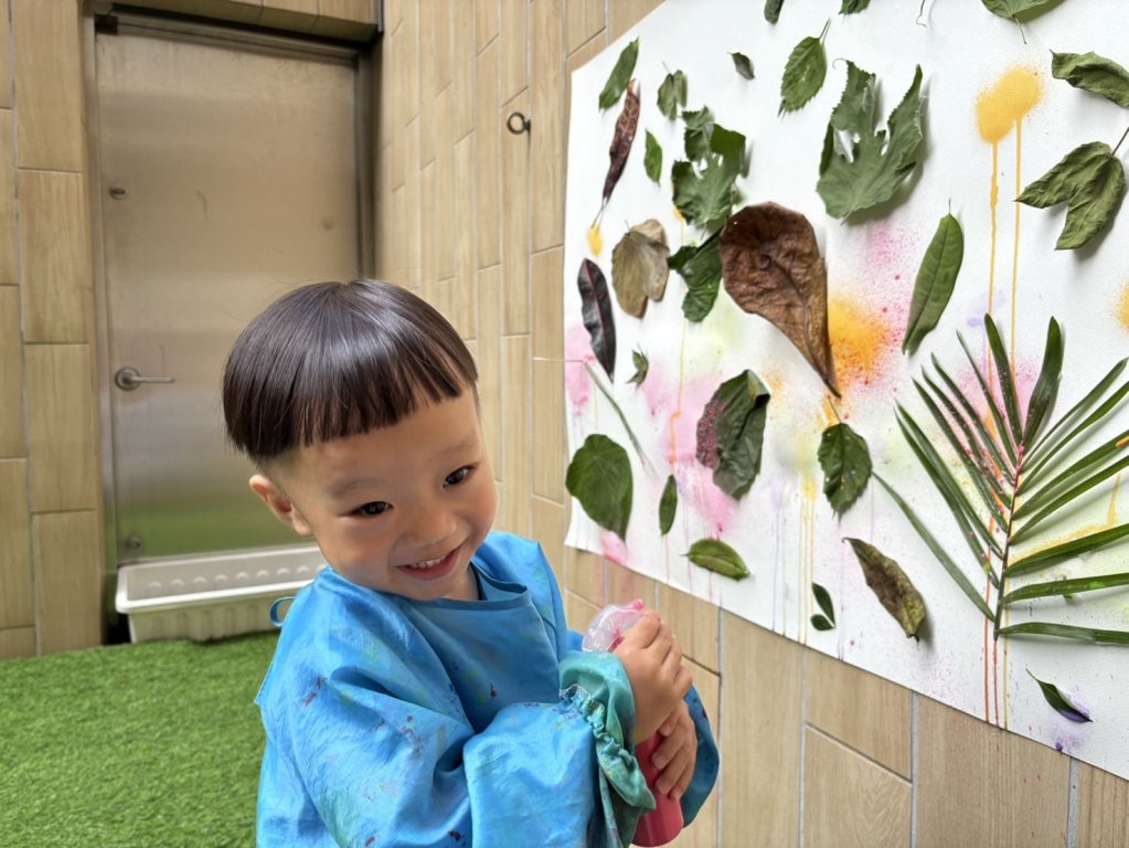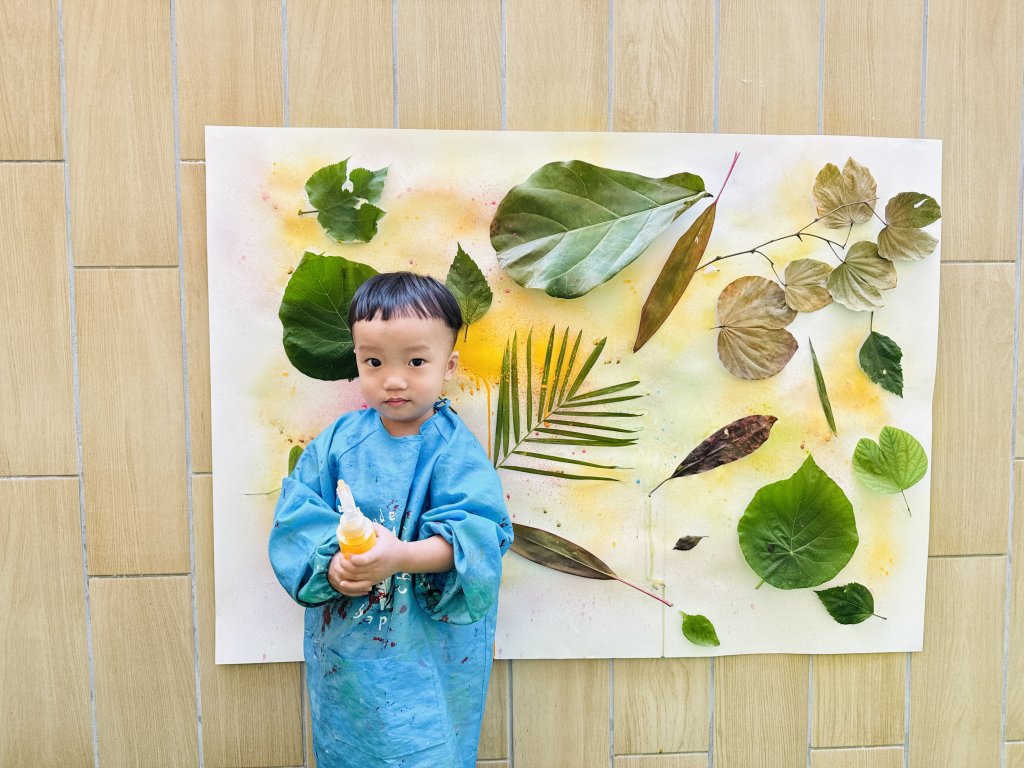在噴畫中,寶貝可以感受顏色的變化,而且能拓印葉子的形狀,提高幼兒對大自然的興趣。