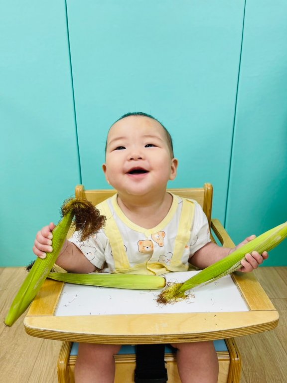 利用玉米筍進行感官活動,摸摸玉米粒和玉米鬚感受不同的觸覺,寶貝一開始拿到玉米,把它當作大奶瓶,就想往嘴裡放,表情超可愛,當玉米鬚觸碰寶貝皮膚,來回移動搔癢的感覺,寶貝表情呈現奇妙的觸感反應喔!手拿玉米嚐,香甜美味真好吃。
