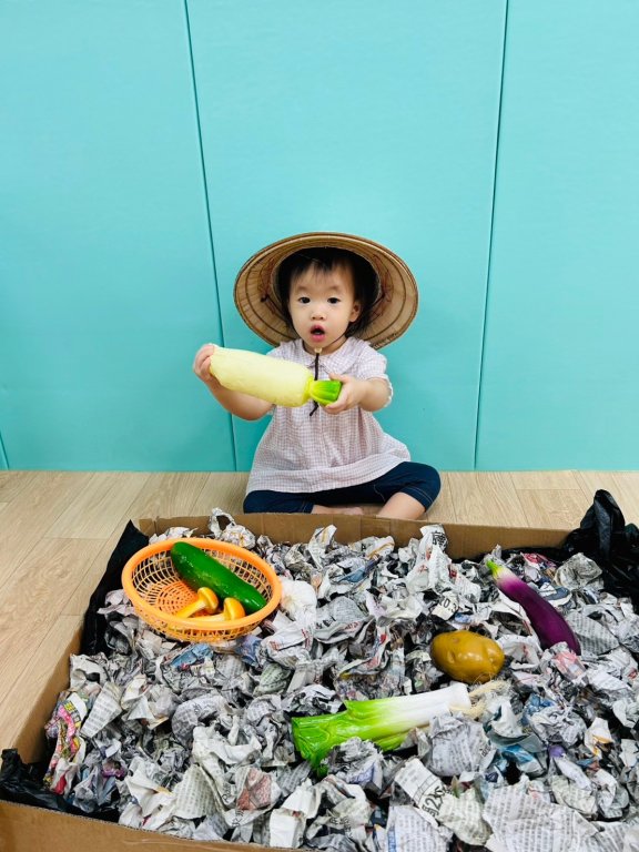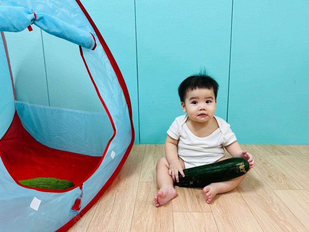 讓寶貝體驗不同的觸感,將蔬菜從寶貝的面前放進帳篷,引導寶貝爬進拿出,觀察寶貝對「物體恆存」概念發展。