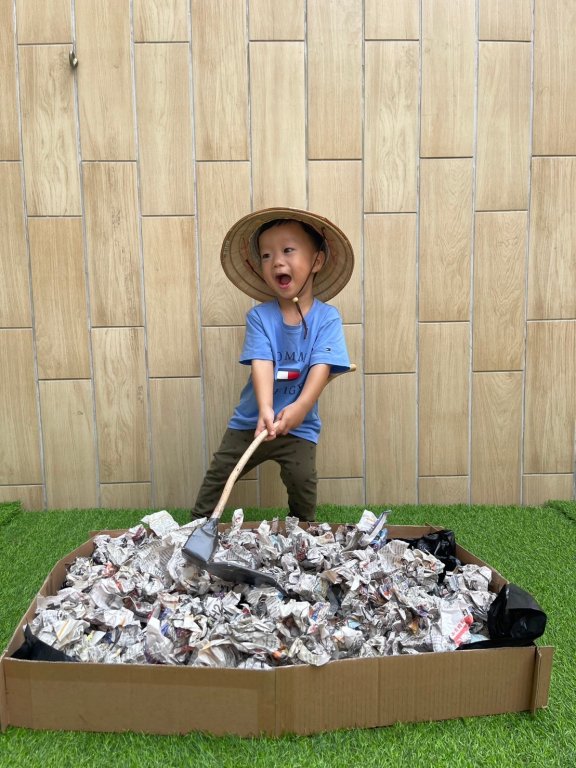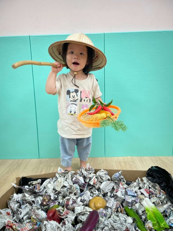 寶貝戴著斗笠拿著鋤頭體驗農夫播種、澆水和採收的辛苦