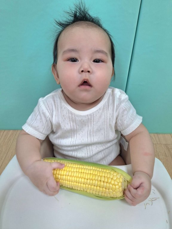 寶貝摸摸玉米粒和玉米鬚,利用小手去感受不同的觸覺,並告知寶貝「玉米」,當玉米鬚觸碰在寶貝皮膚上搔癢的感覺,寶貝表情呈現奇妙的觸感反應,看著可愛的笑容,感染大家的好心情。利用玉米筍進行感官活動,摸摸玉米粒和玉米鬚感受不同的觸覺,寶貝一開始拿到玉米,把它當作大奶瓶,就想往嘴裡放,表情超可愛,當玉米鬚觸碰寶貝皮膚,來回移動搔癢的感覺,寶貝表情呈現奇妙的觸感反應喔!手拿玉米嚐,香甜美味真好吃。