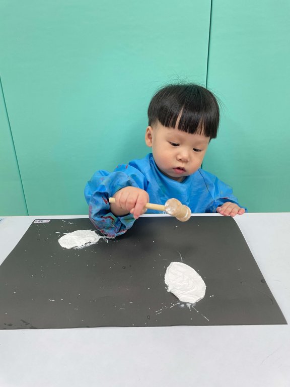 棉花沾白色顏料,寶貝拿著木頭槌子,敲打顏料,看看寶貝打出來的小怪獸~
