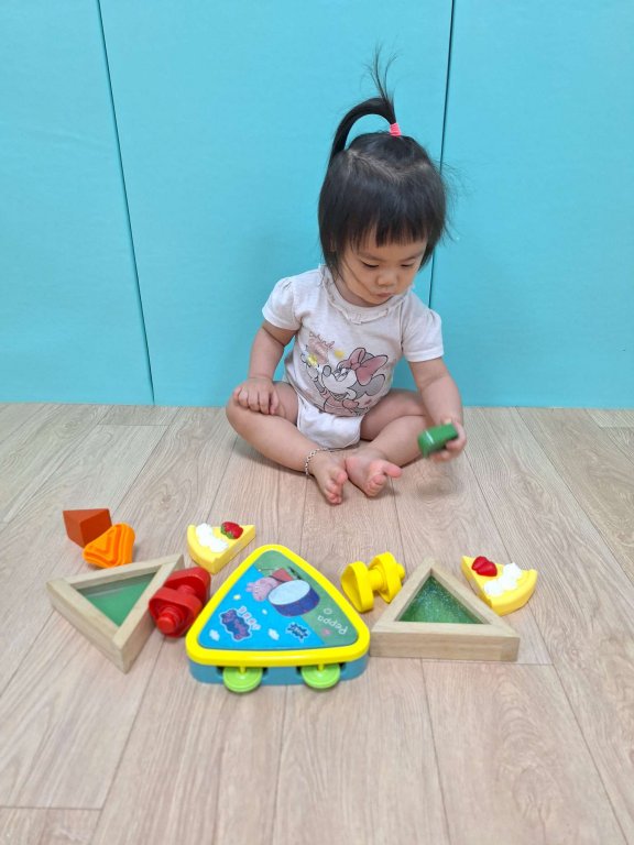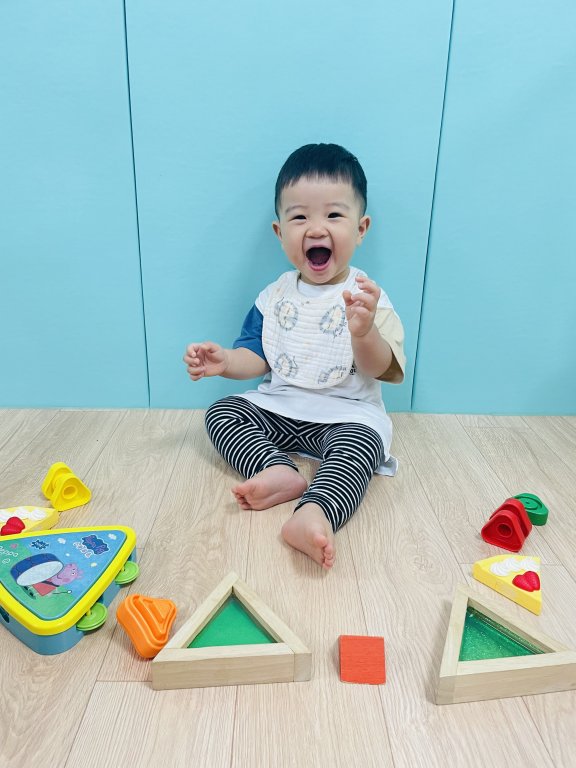 在活動中準備常見的各種三角形物品、玩具讓寶貝探索;哇!原來生活中有這麼多都跟三角形相關的物品,透過雙手摸一摸、捏一捏、玩一玩,透過耳朵聽一聽物品敲打發出的聲音,透過雙眼仔細觀察,仔細觀察下來會發現這些不同的東西,都有相同的圓形喔,在認識三角形的物品中,寶貝也會挑選自己特別喜歡的物品玩。