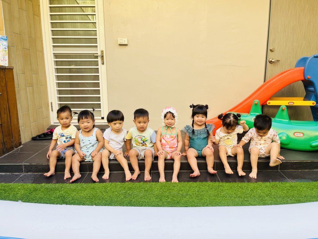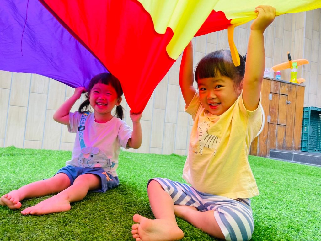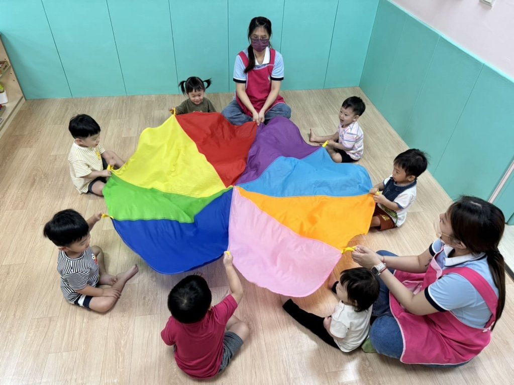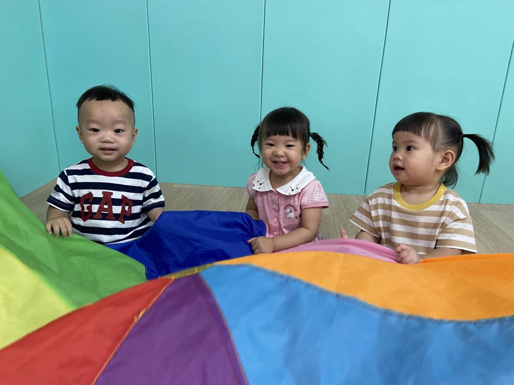 寶貝跟著同學一起聽口令做出大海浪、小海浪的動作,培養團隊默契,融入在歡樂氣球傘中。