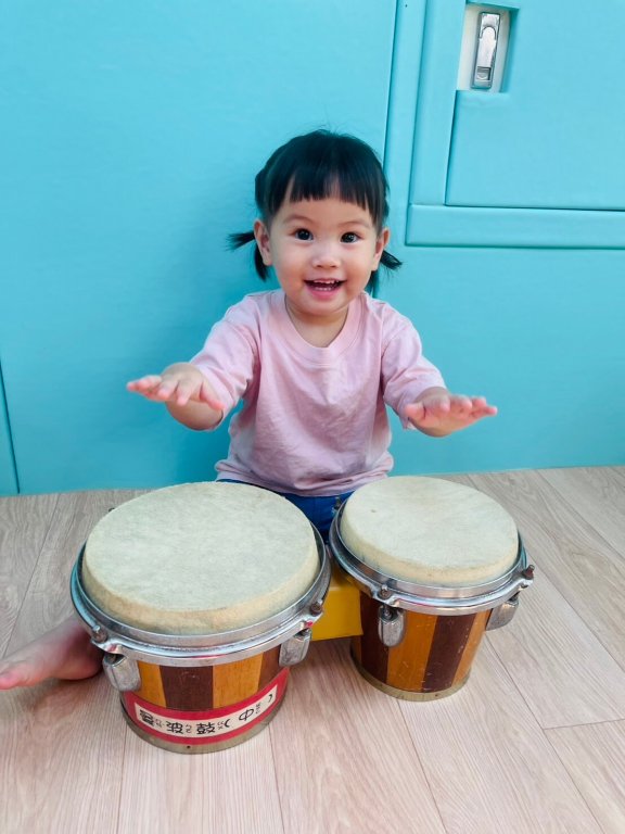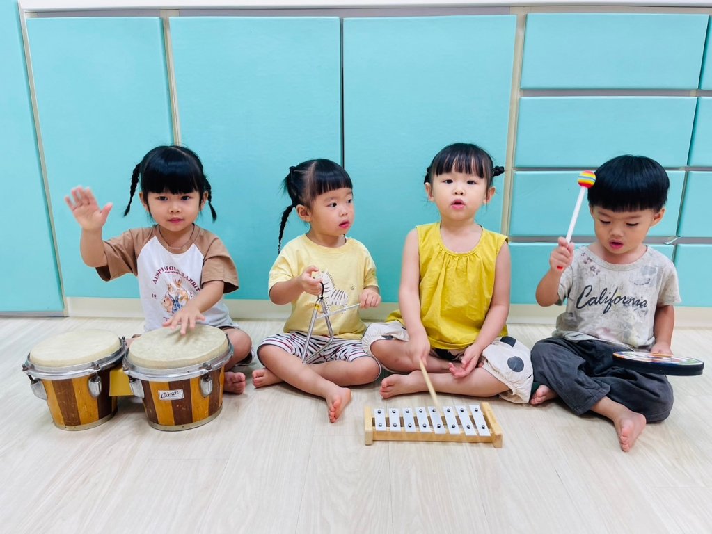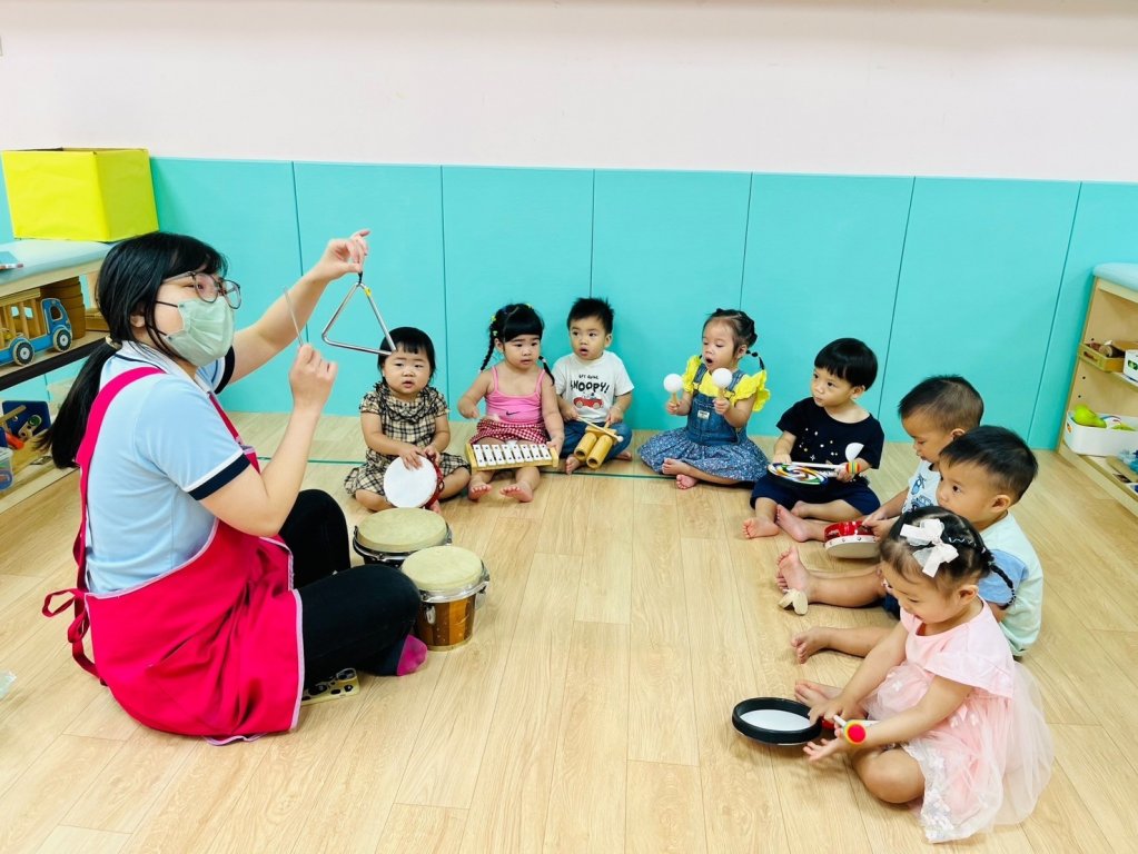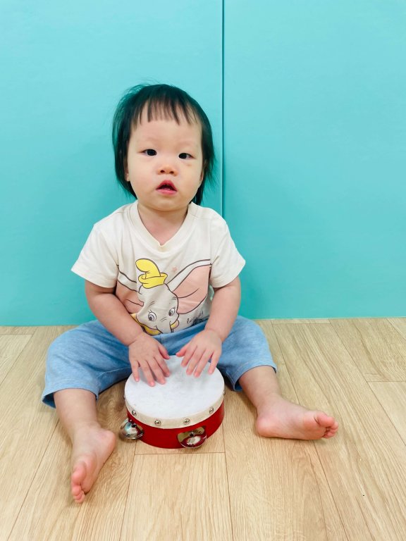 看看寶貝拿著什麼形狀的樂器敲打著?有三角鐵、鈴鼓、鐵琴..等