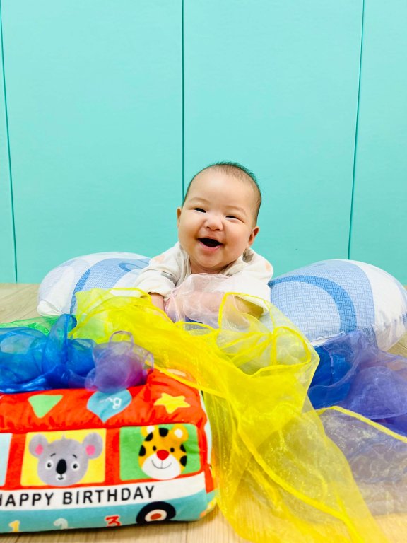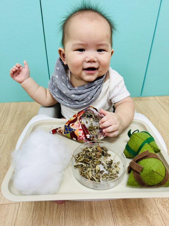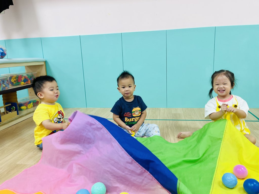 寶貝跟著同學一起聽口令做出大海浪、小海浪的動作,培養團隊默契,融入在歡樂氣球傘中。