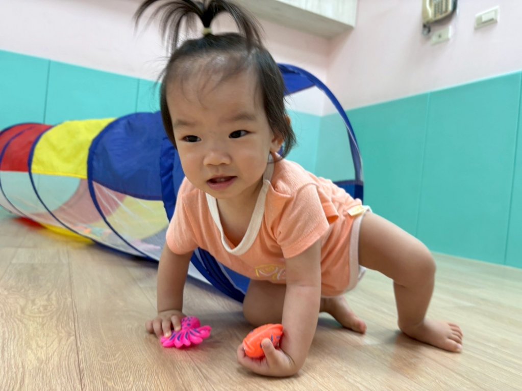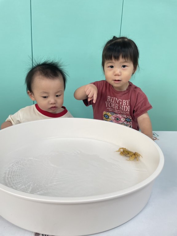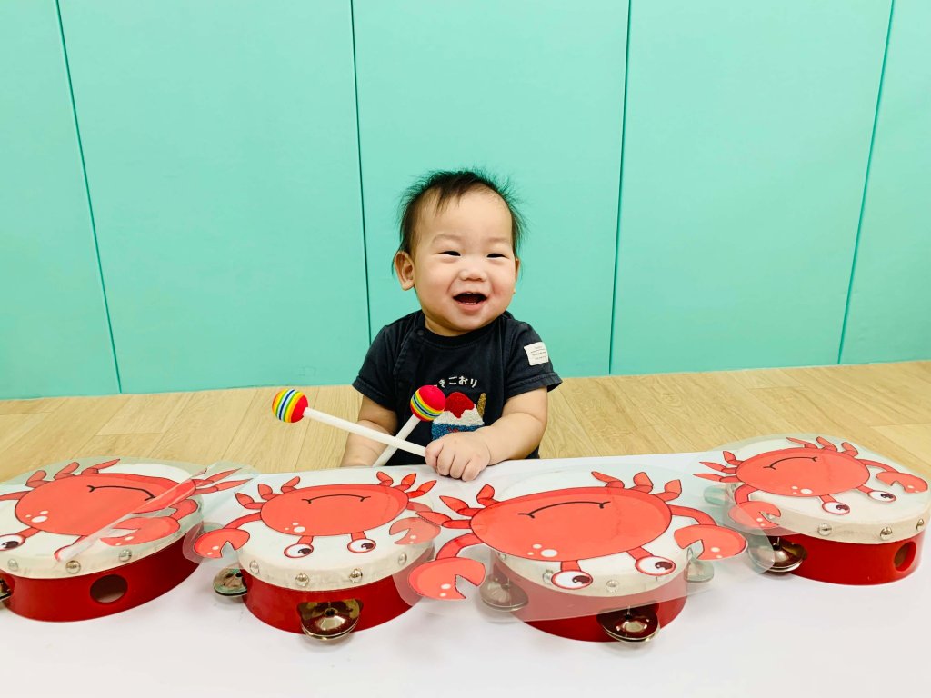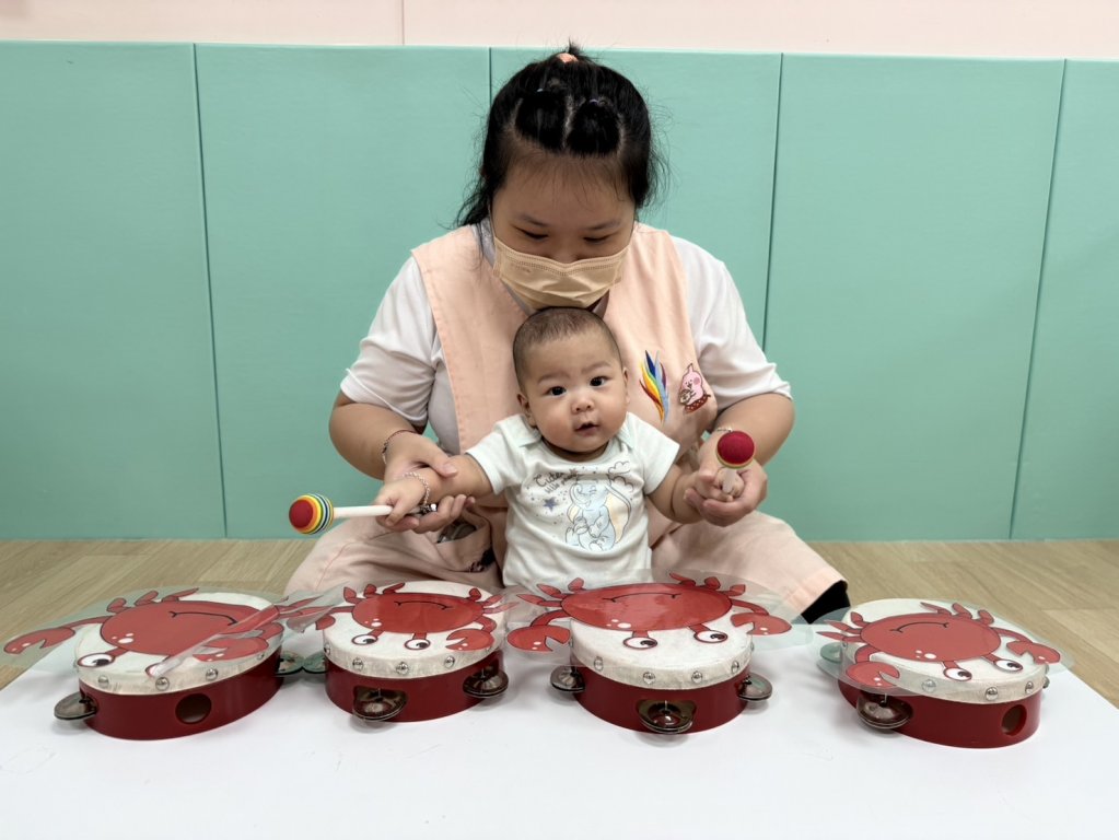 「寶寶在老師的協助下,開心地敲打螃蟹鈴鼓,感受節奏的變化與聲音的樂趣,培養手眼協調能力與聽覺反應!」