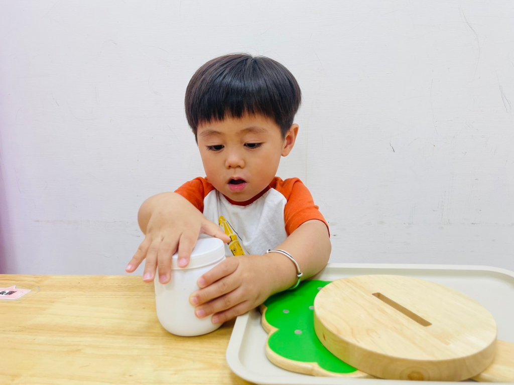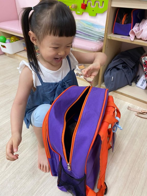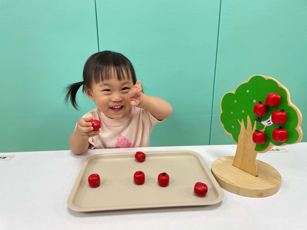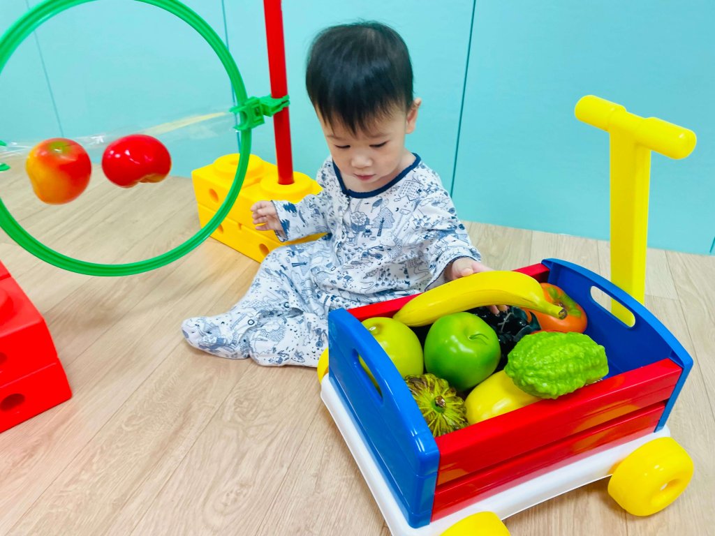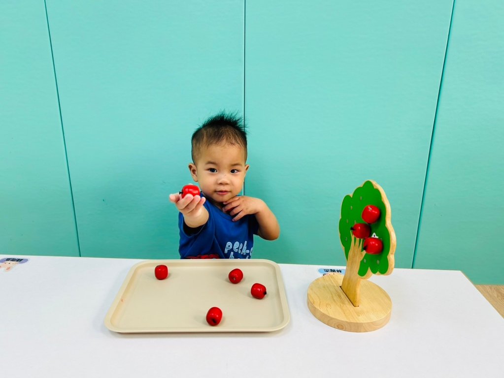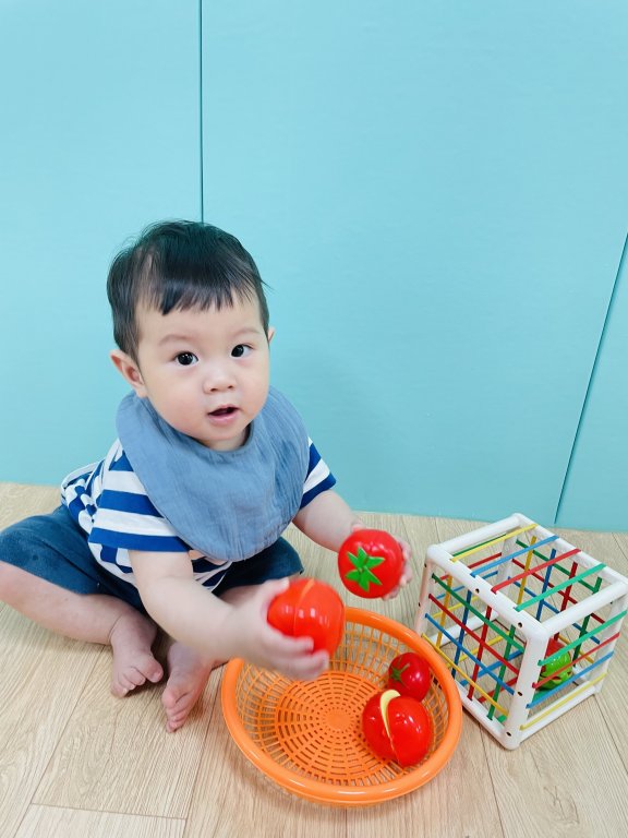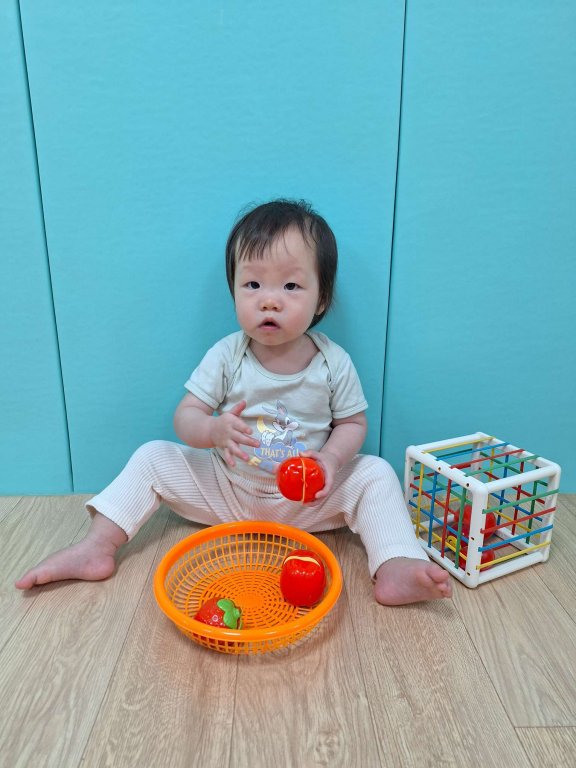 看看這些是什麼水果呢?老師介紹常見的水果讓寶貝認識,引導寶貝透過遊戲方式從籃子裡拿出水果模型,利用小手抓物能力,將物品塞入塞塞樂教具中,藉由這個遊戲培養寶貝的握力能力,細動作發展好,認知發展相對提高喔!寶貝們很棒,都能將水果準確的塞入塞塞樂教具裡面喔!