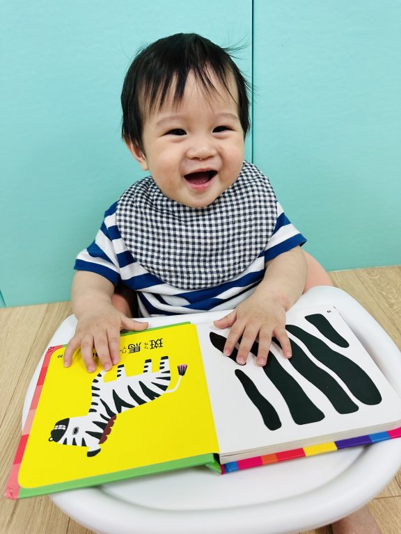 打開觸覺書,讓寶貝摸摸一條條的紋路,感受立體浮出的紋路。咦!這是黑白條紋的斑馬!哇!這是顏色鮮明的花豹呢!藉由語言的互動讓寶貝用手觸摸,引導寶貝認識動物,藉由書本裡百變的鮮艷花色,加強視覺的刺激吸引寶貝的目光,同時達到視聽覺和觸覺的學習!