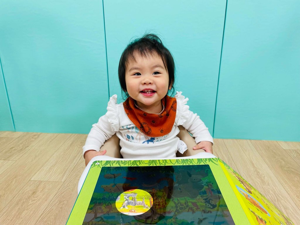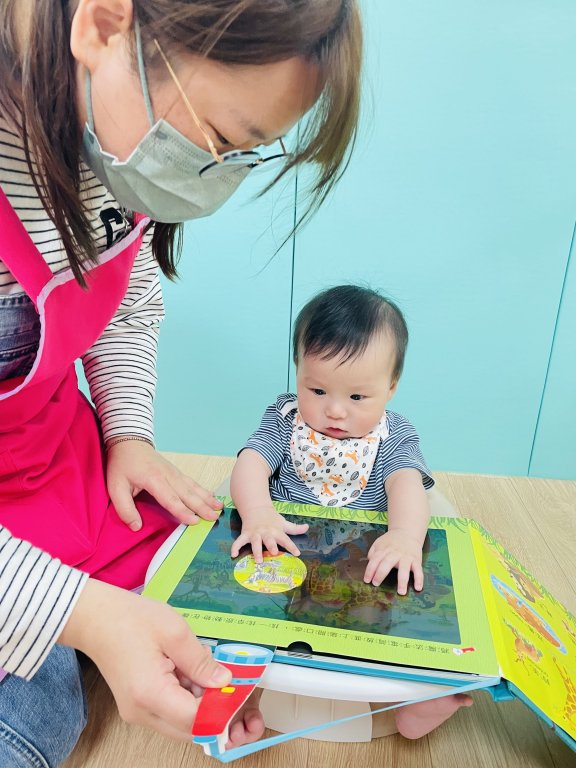 透過視覺的傳達帶領寶貝認識動物,利用手電筒照影的方式吸引寶貝目光,這個階段的寶寶視覺發展,喜歡觸摸所有看到的新事物,手眼協調能力快速成長。