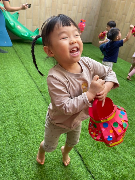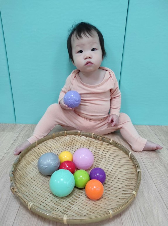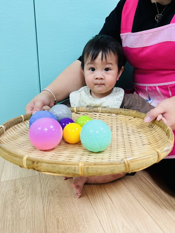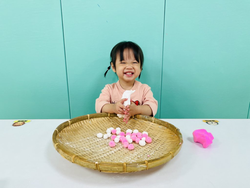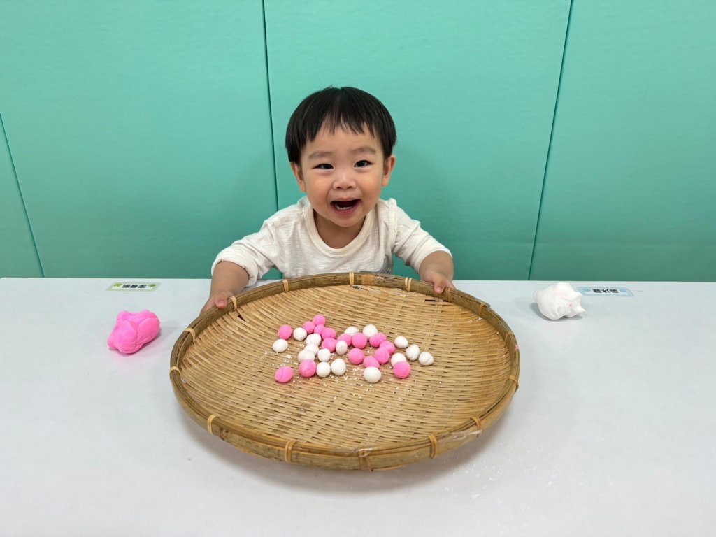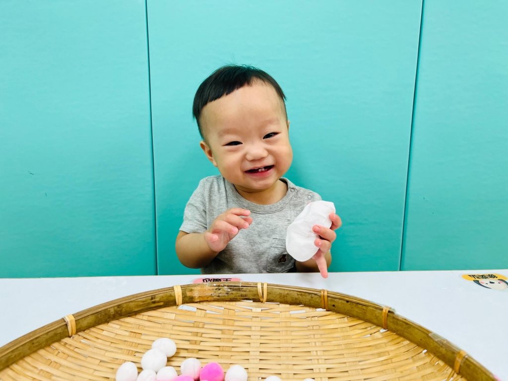 本次節令活動中讓寶貝動動小手搓搓湯圓,再利用雙臂賣力的搖搖竹篩,寶貝看著竹篩上滾動的湯圓,覺得很有趣呢~