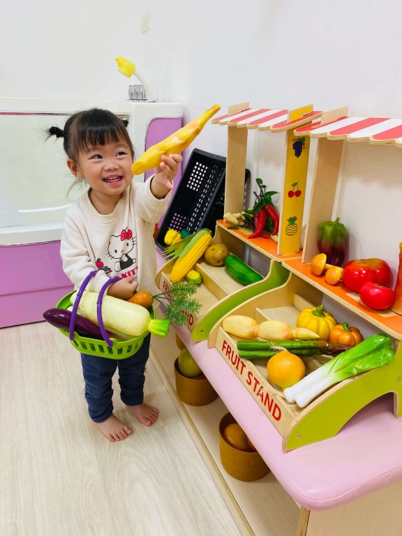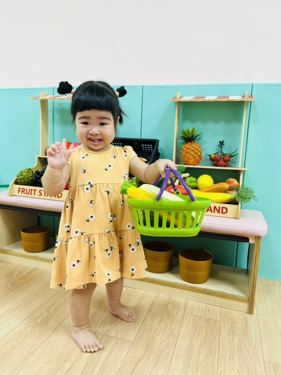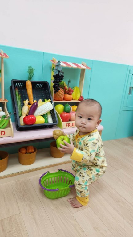 來看看寶貝開心越過吉士山丘,拿起菜籃認真選自己喜愛的蔬菜哦!天天吃菜好健康~~