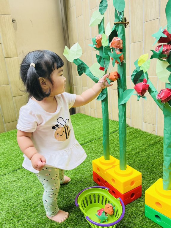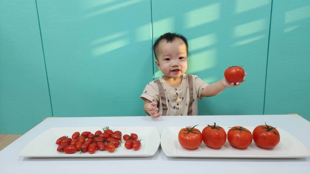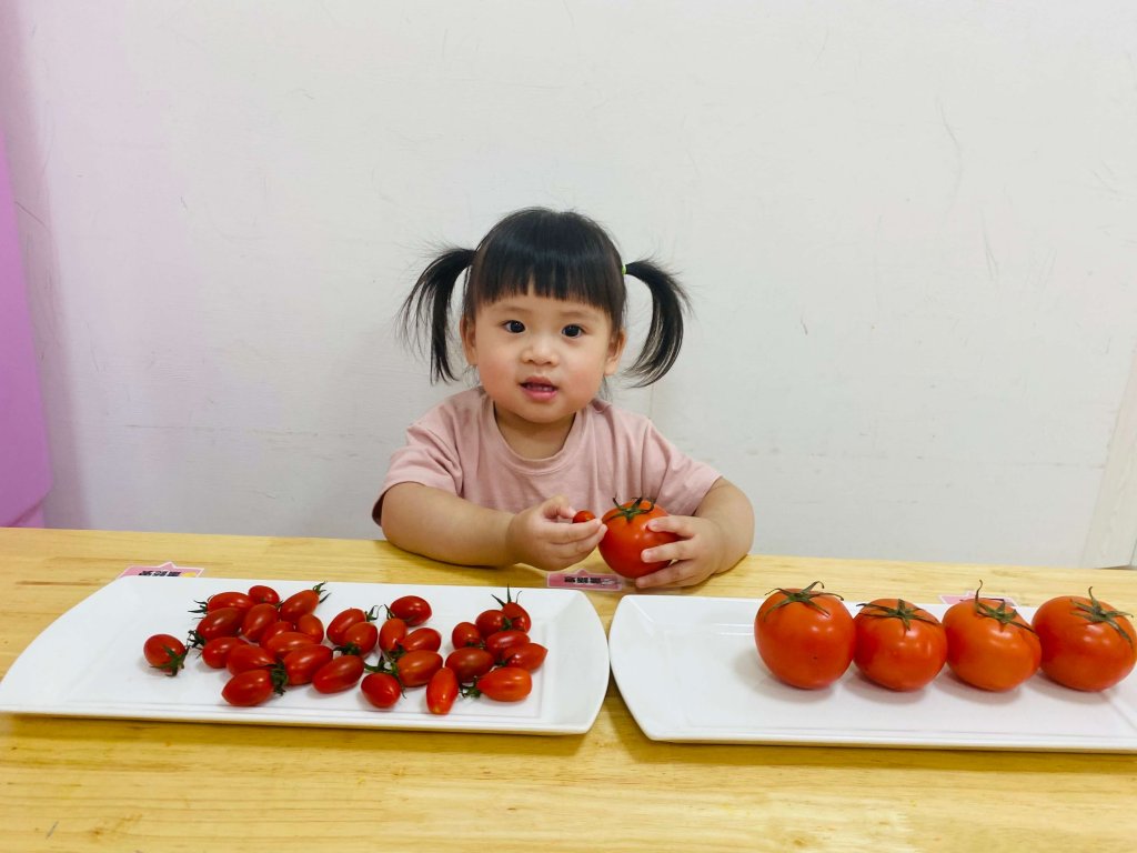老師引導寶貝當小小試吃員先認識番茄,分辨大小番茄,摸摸番茄果皮,一起來採小番茄,介紹番茄是蔬菜也是水果喔!