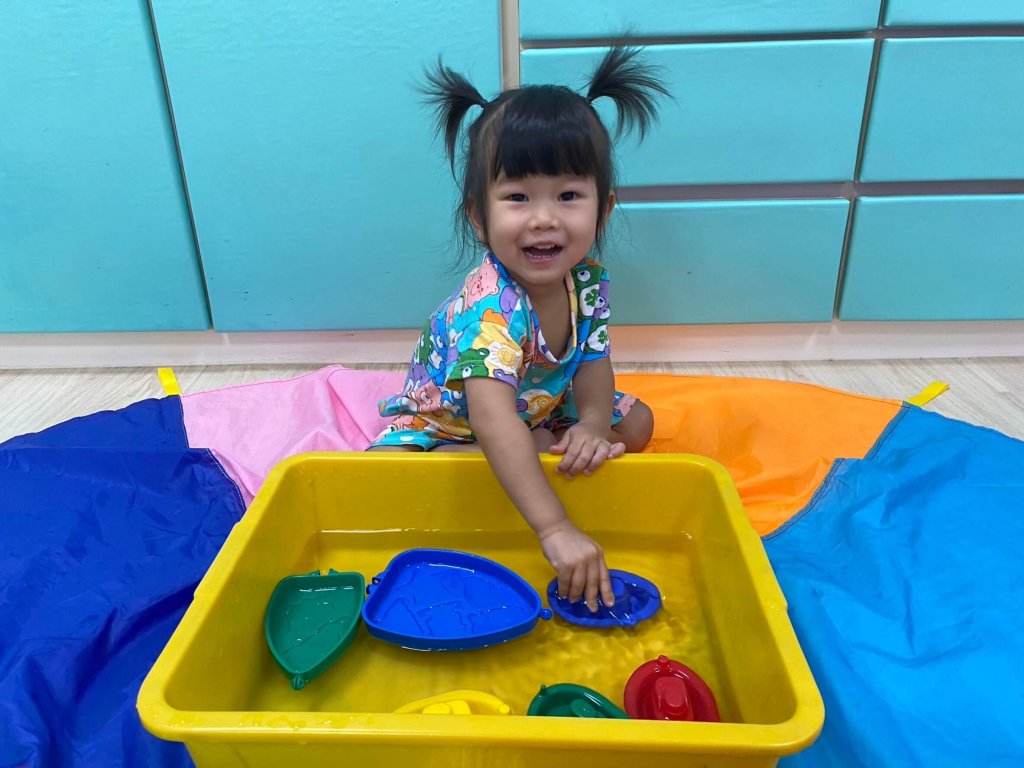 老師引導孩子介紹船的交通工具,透過玩船遊戲讓孩子認識大船和小船體驗滑水,也認識船是在水上的交通工具。