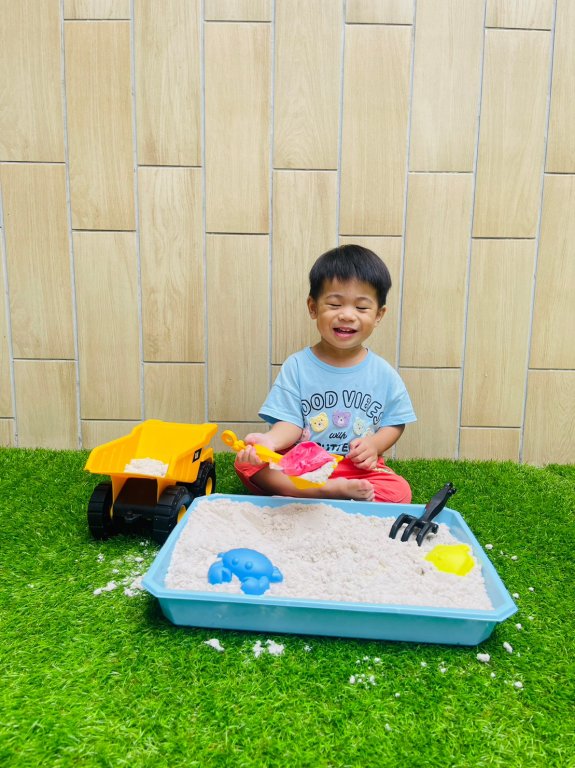 寶貝拿起鏟子在動力沙中挖呀挖~挖出彩鹽袋,放入砂石車中 玩沙子能激發孩子觸覺發展呦!