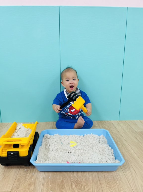 哇~看看寶貝在做什麼呢?原來在探索動力沙裡有什麼~看一看砂石車有大大的車斗,可裝進很多的沙子,它大大的車輪可快速的滾動著!