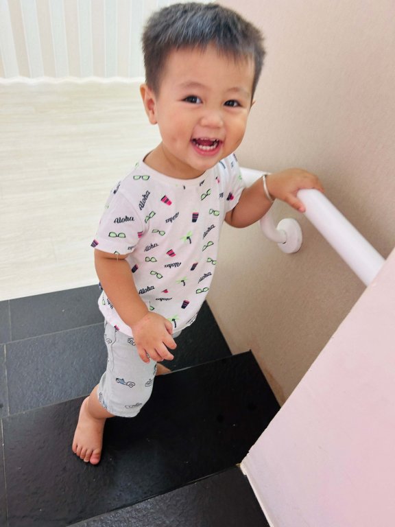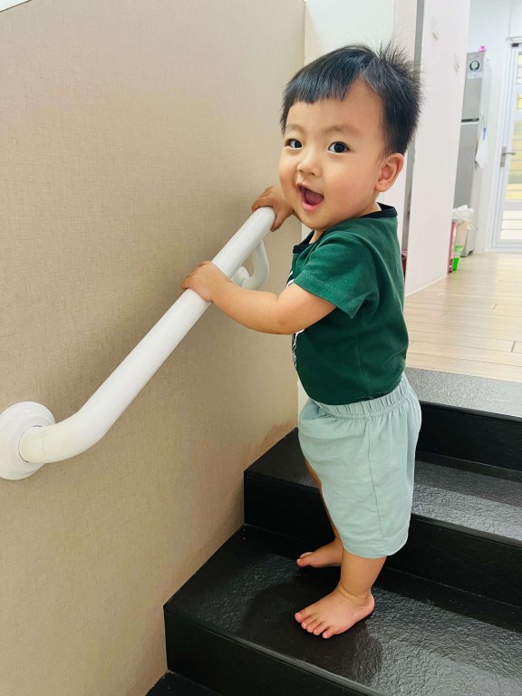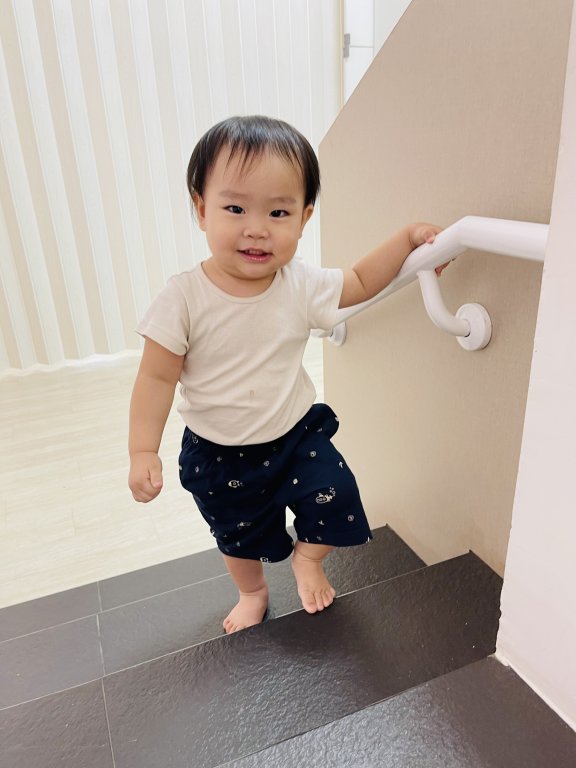 我長大了,可以一隻手扶住欄杆,慢慢上樓梯,透過上下樓梯可以訓練眼、手、腳協調。