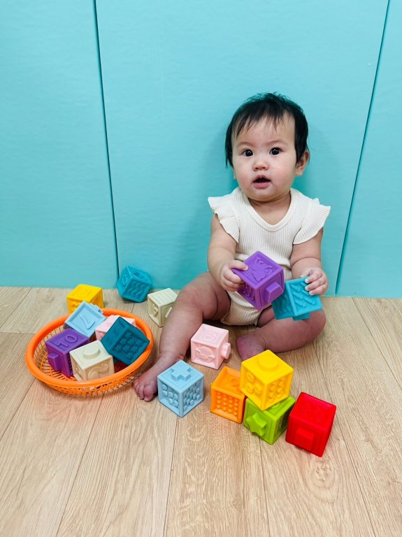 課程中準備軟膠材質的積木,每一面有不同凹凸圖案,可刺激寶寶從遊戲中抓握,加強寶寶感覺統合的能力~