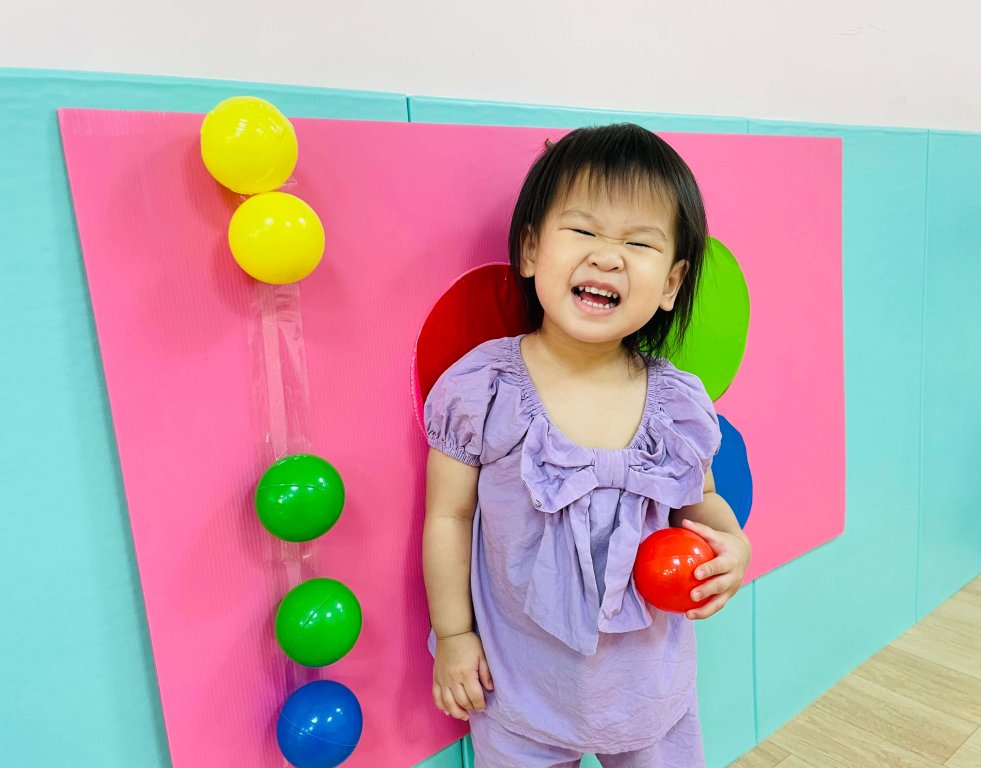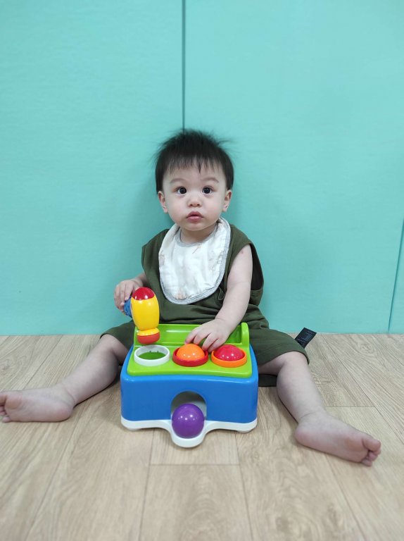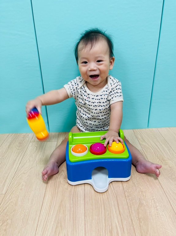 拿起槌子敲一敲看看敲到什麼色的球,此活動可以訓練寶貝的抓握能力以及手眼協調