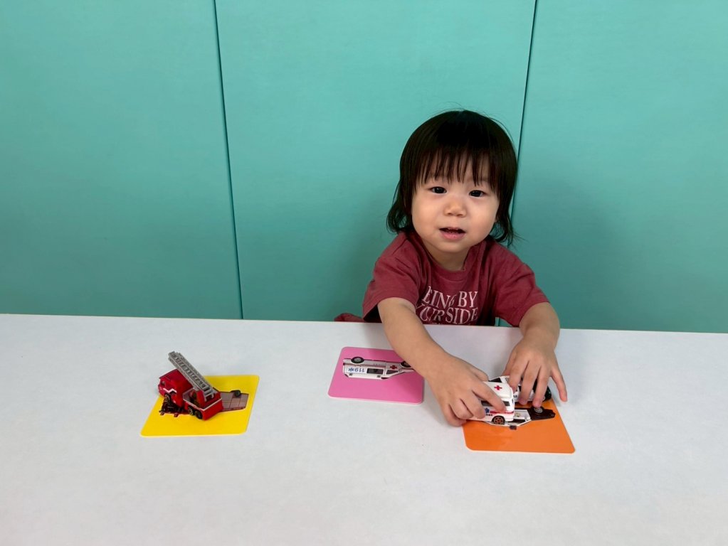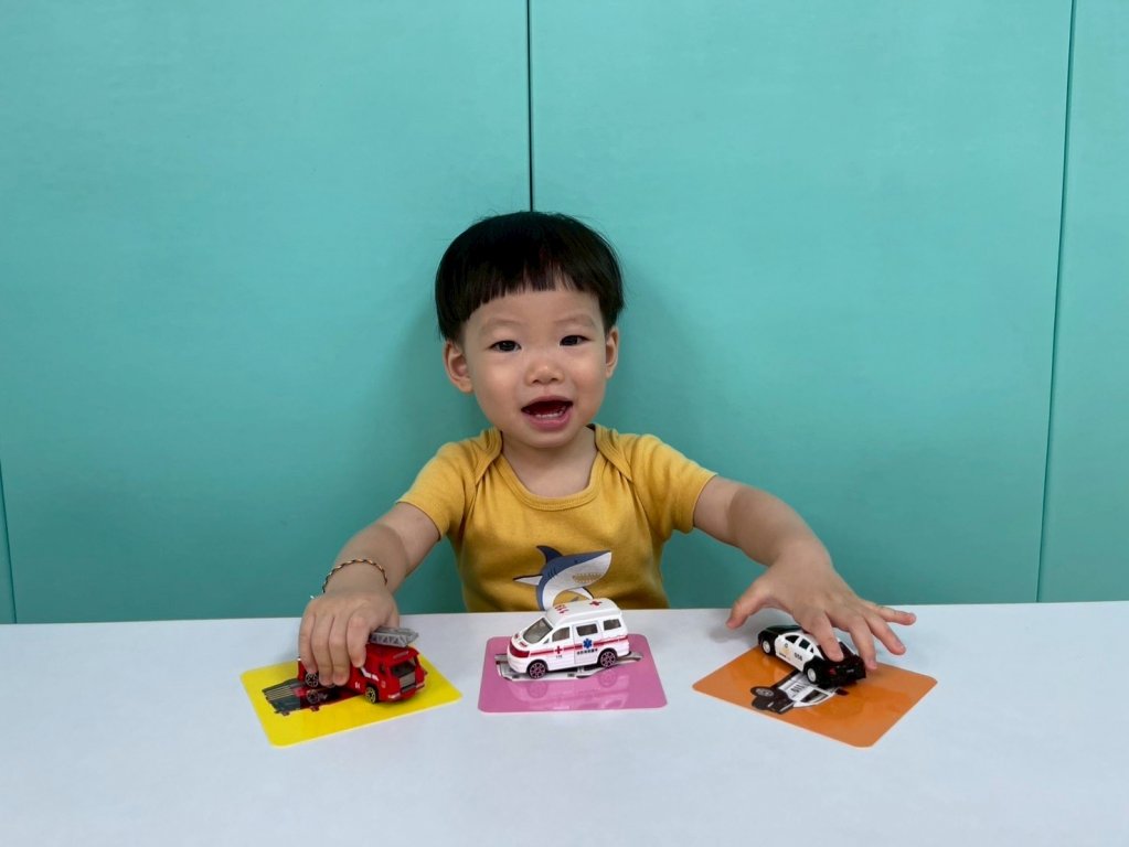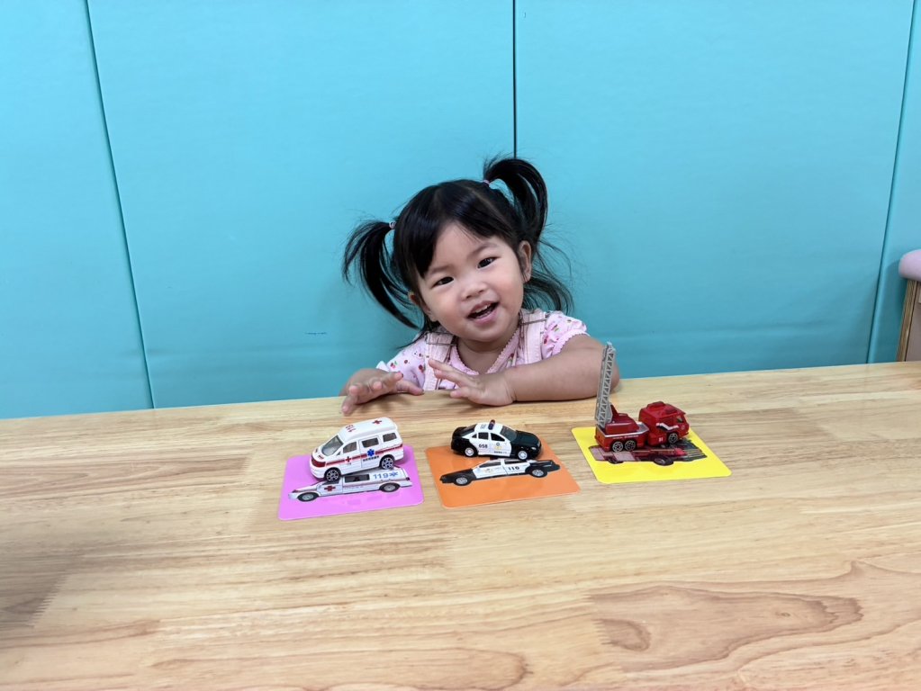 我們進行了配對車子活動,透過圖卡的方式引導幼兒認識救護車、警車與消防車