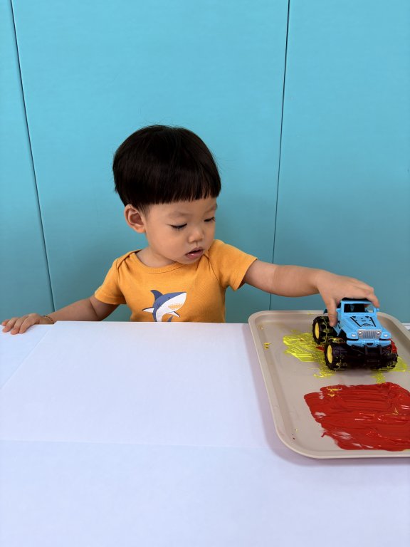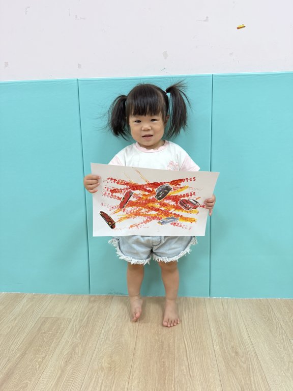 寶貝把車輪滾進顏料裡,推著車車在白紙上奔跑,紅紅黃黃的顏料就像小汽車的軌跡,留下了獨一無二的藝術作品,寶貝的滾輪畫是不是很繽紛漂亮呀。🚗🚗