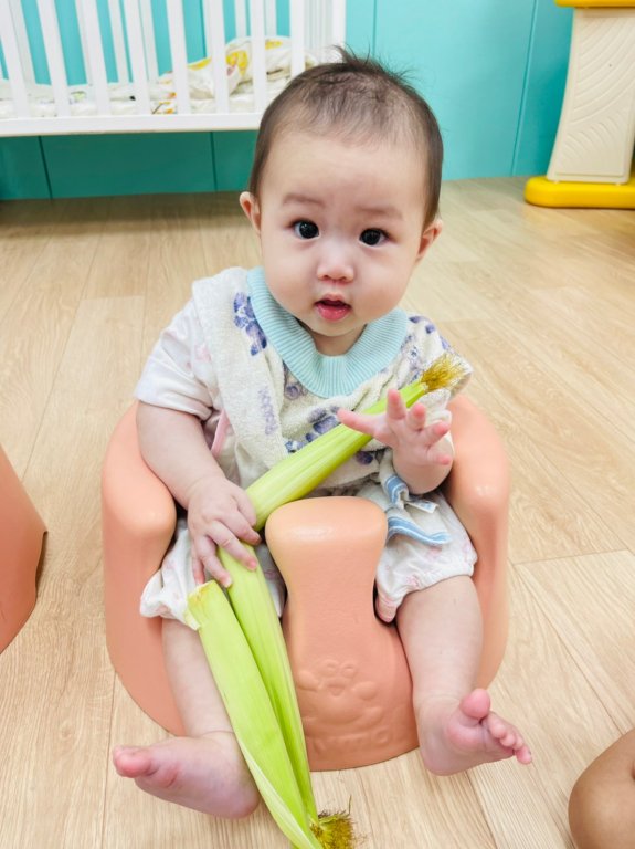 摸一摸玉米筍的觸感,吃副食品的寶貝品嚐香甜的玉米筍,可幫助寶貝練習抓握吞嚥,寶貝們的表情都很滿足呢~