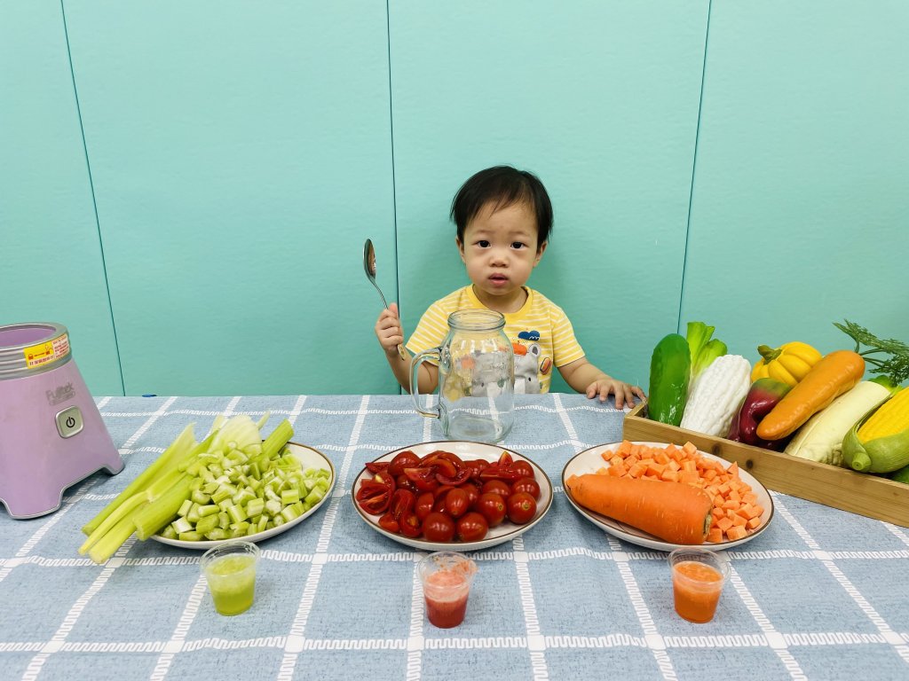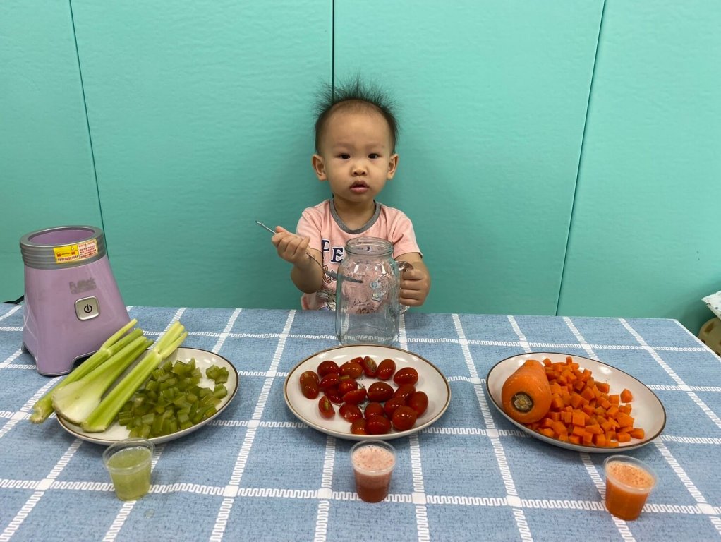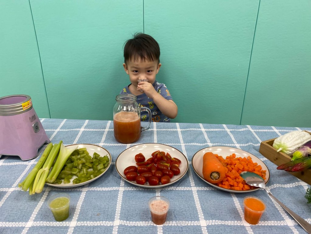 蔬菜的課程中,老師利用五感帶領寶貝認識、探索各種的蔬菜,將蔬菜放入果汁機,觀察蔬果變蔬果汁,有模有樣的操作工具,品嚐到含有豐富的維生素、膳食纖維的蔬果汁囉!