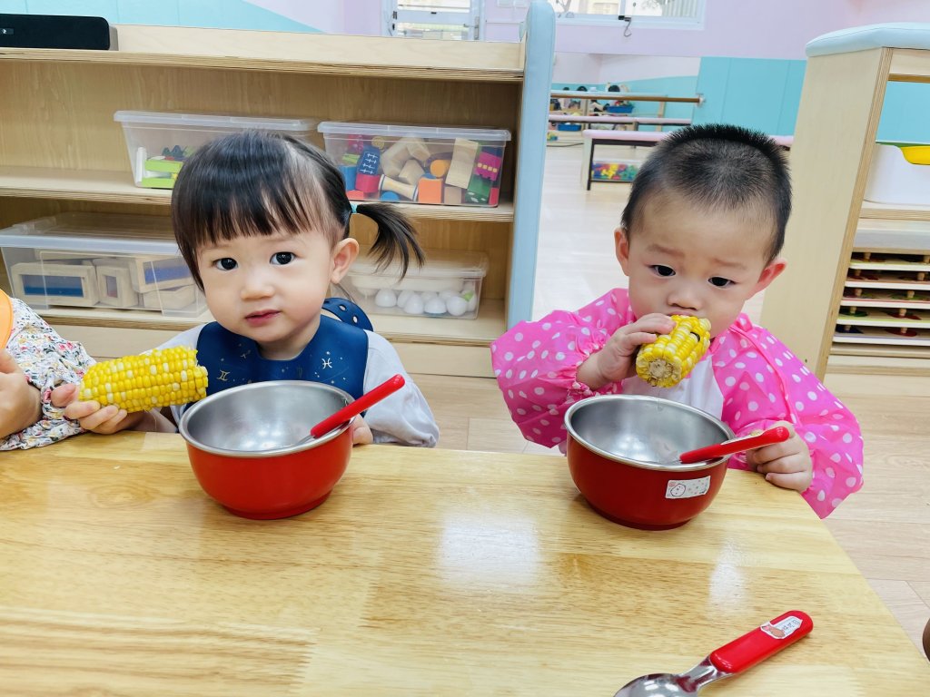 黃黃的玉米吃起來甜甜的,寶貝自己動手吃著甜玉米,可練習抓握,練習咀嚼,也有助於自信心的建立。